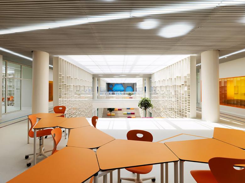 Der Marktplatz ermöglicht einen interaktiven Gemeinschaftsbereich und umfasst einen offenen Lernbereich mit einem geschlossenen Raum für konzentrierte Teamarbeit. Der Versammlungsraum ist eine offene Bibliothek und ein grünes Atrium, in dem sich die Studenten in ihrer Freizeit treffen. Darüber hinaus ist das Forum ein Auditorium und fungiert als vertikale Verbindung zwischen den Stockwerken.