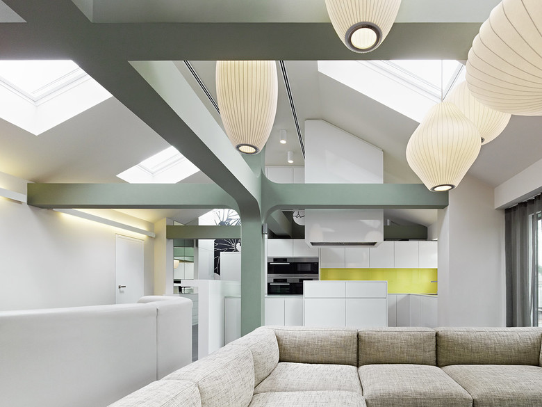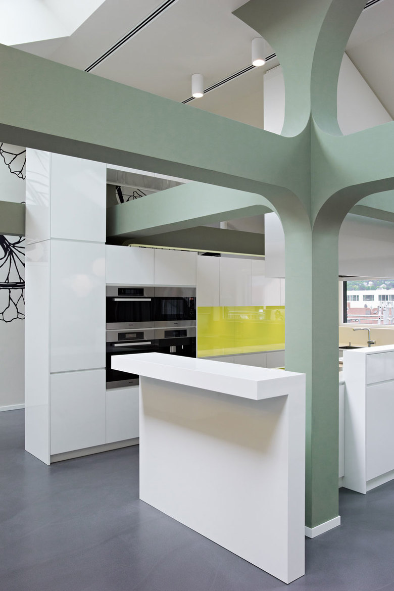 Für eine junge Familie wurde ein Penthouse in zentraler Stuttgarter Lage gestaltet. Im Zentrum steht der großzügige loftähnliche Wohn-, Koch- und Essraum. Die offene Dachkonstruktion wurde in ein raumprägendes Gestaltungselement transformiert. Sie ist vollständig verkleidet und bildet mit ihrer Farbgebung und den geschwungenen Formen einen Kontrast zu den kubischen Möbeln und Einbauten. Treffen beide aufeinander, ordnen sich letztere spielerisch der Dominanz der Säulen und Balken unter, die teilweise durch Lichtfugen noch betont wird.