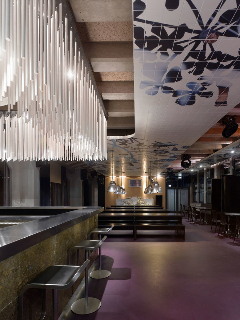 Zunächst wurde der Raum neu organisiert. Die Bar wurde in den Mittelpunkt gerückt und zoniert so den langgestreckten großen Raum in drei übersichtliche Bereiche, die sich nun separat nutzen lassen und selbst noch einmal durch Fadenvorhänge abteilbar sind. Der Hauptbereich lässt sich so je nach Nutzung oder Veranstaltungsart in Größe und Wirkung stufenlos schalten und wirkt trotzdem immer intim. Die Rückwände in den Nischen sowie die Front des Tresens sind mit Muschelkalkplatten verkleidet, sodass sie in der Frontansicht eine durchgehende Fläche bilden. Der Muschelkalk wird durch Halogenlicht beleuchtet. Diese bringen dessen poröse Materialstruktur und Tiefe zur Wirkung und entfalten eine warmtonige, goldfarbene Lichtstimmung. Gleichzeitig wird so das Angebot der Bar besser inszeniert. Unterstützt wird dies durch 2500 einzeln abgehängte Kunststoffstäbe, in denen sich das Licht verführerisch verfängt.
