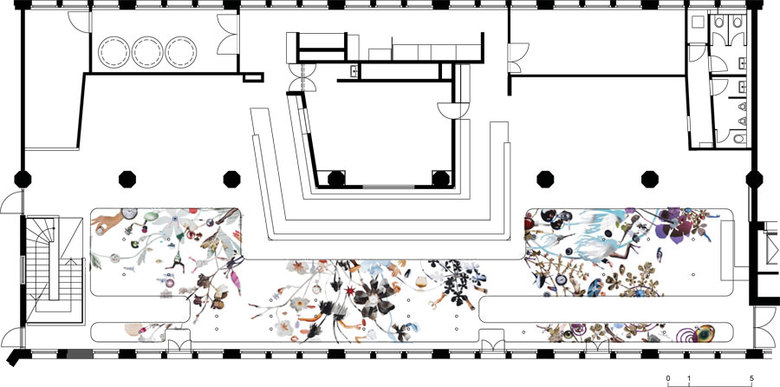 Die einzelnen Bereiche des Raumes werden durch den durchlaufenden, mauvefarbenen Boden verbunden, der im Kontrast zur denkmalgeschützten Industriearchitektur des Ortes steht. Identitätsgebendes Key Visual aber ist eine neue abgehängte, geflieste und mit Motiven bedruckte Decke. Sie fasst den Raum noch einmal zusammen und legt sich wie eine Schicht vor die Bestandsarchitektur. Die Fliesen zitieren dabei das Küchenthema und den einstigen Brauhauscharakter. Ihre weiße Farbe reflektiert das Licht und wird so zur indirekten Lichtquelle. Eine riesige surreale Collage, die die Stuttgarter Künstlerin Monica Trenkler entworfen hat, wurde in einer Spezialdruckerei im 4C-Verfahren auf die Fliesen gedruckt und richtet die Aufmerksamkeit der Besucher auf die Decke. In den vielen kleinteiligen Elementen entdeckt man Kurioses, Abseitiges oder Erotisches und liefert damit Augenfutter und Gesprächsstoff für die Gäste. Die Deckencollage wirkt damit identitätsstiftend für das generalüberholte Mash und findet sich konsequenter Weise im überarbeiteten Corporate Design und den Printpublikationen des Clubs wieder.