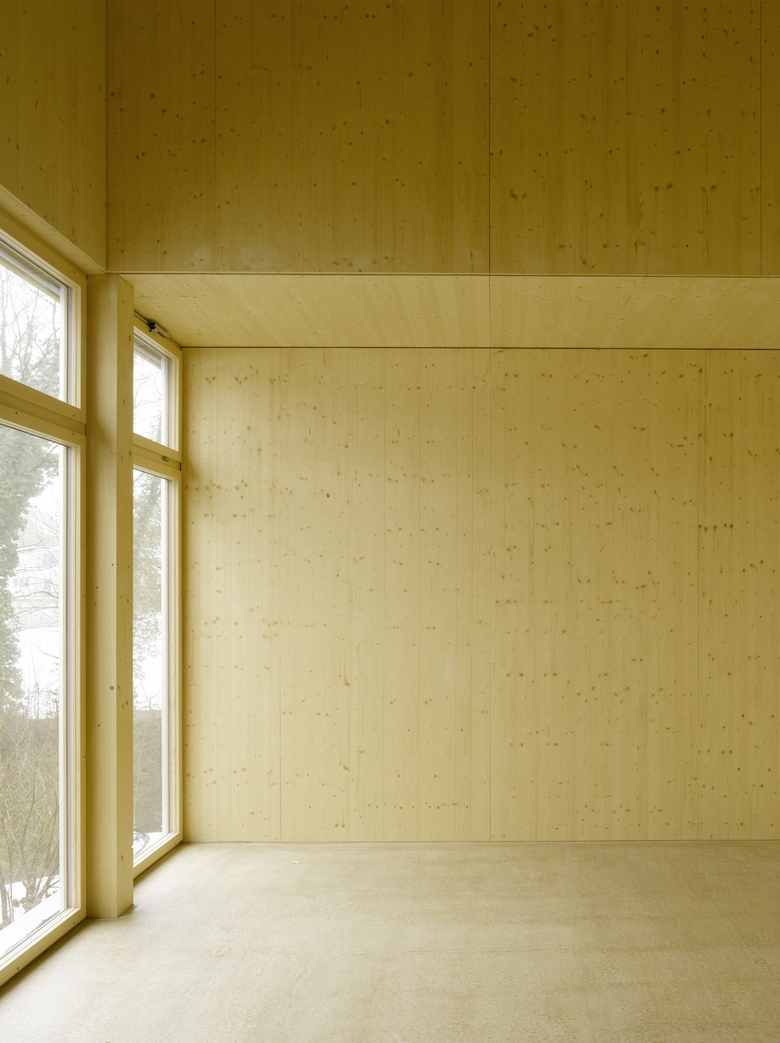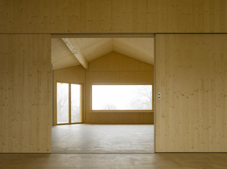 Als Referenz für den Anbau dienen die Scheunen in der Umgebung mit ihrem landwirtschaftlichen Charakter, ihren organisch gewachsenen Baukörpern und ihren einfachen Holzverkleidungen. Für alle neuen Bauteile wurden vorfabrizierte Holzelemente verwendet, bei welchen innen die unbehandelten Holzplatten und aussen die ungehobelte Holzschalung sichtbar ist. Für die Innenwände und Innentüren wurden dieselben Holzplatten eingesetzt. Der Boden besteht aus einem Zementestrich, welcher mit einem leicht ocker gefärbten Steinöl behandelt wurde. Durch die Materialisierung wirkt der Innenraum wie eine einheitliche Schale.