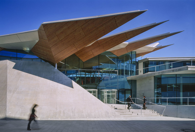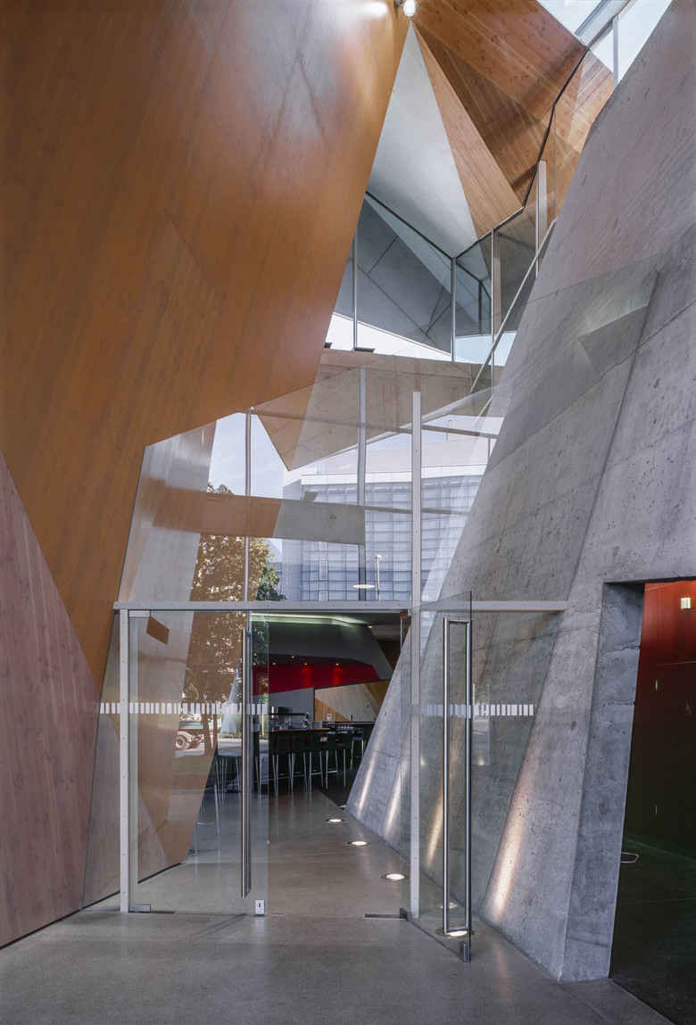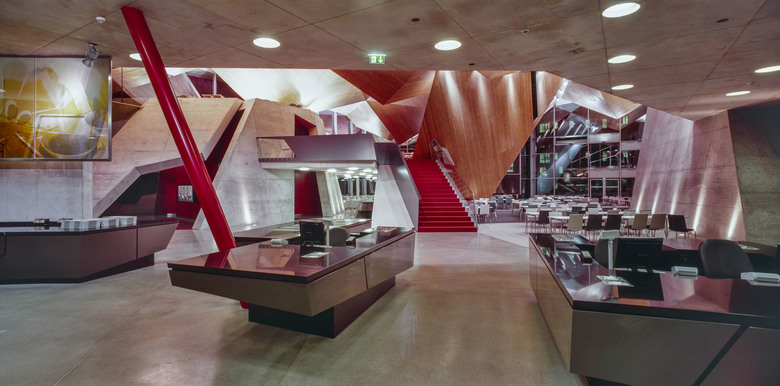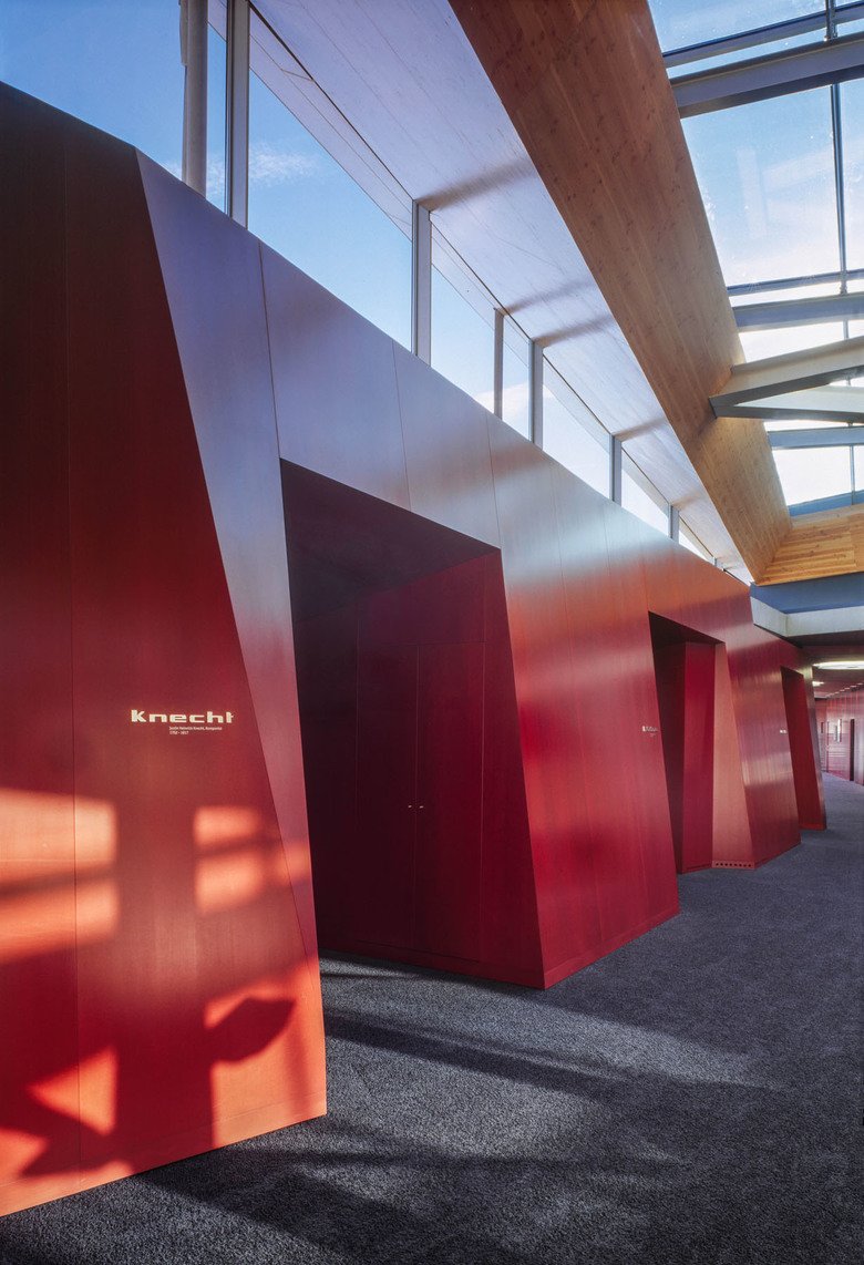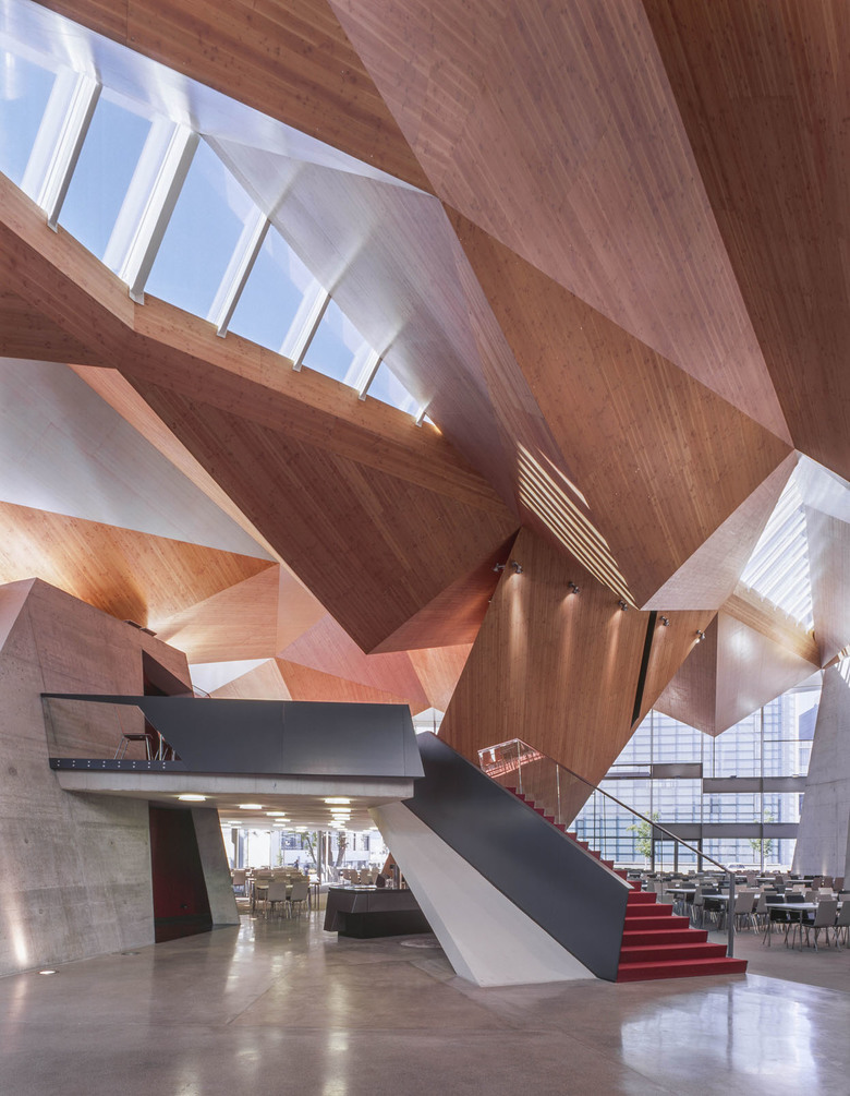 Der Gastraum – Unter einer bewegten großflächigen hölzernen Dachlandschaft nehmen täglich ca. 2.200 Mitarbeiter auf 680 Sitzplätzen ein Mittagessen ein. Formal gestaltete steinerne Volumen tragen das Dach und beinhalten die Infrastruktur für den Gastraum. Das Dachtragwerk über dem Gastraum tritt in seinen statischen Details nicht in Erscheinung: Vielmehr überspannt ein räumliches, hölzernes „Faltwerk„ scheinbar stützenfrei den großen Gastraum und leistet gleichzeitig die signifikanten Auskragungen, welche jeweils die Logik dieser Form zu Ende führen. Die in Beton materialisierten Volumen wachsen nach oben (Stalagmiten) und die hölzern ausgebildeten Elemente der Dachlandschaft wachsen nach unten (Stalaktiten) und gliedern so gemeinsam den großzügigen, fließenden Gastraum in unterschiedliche Teilbereiche.