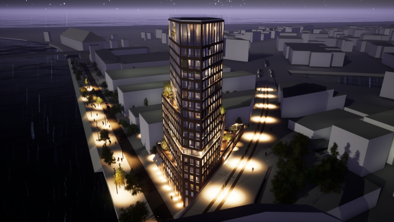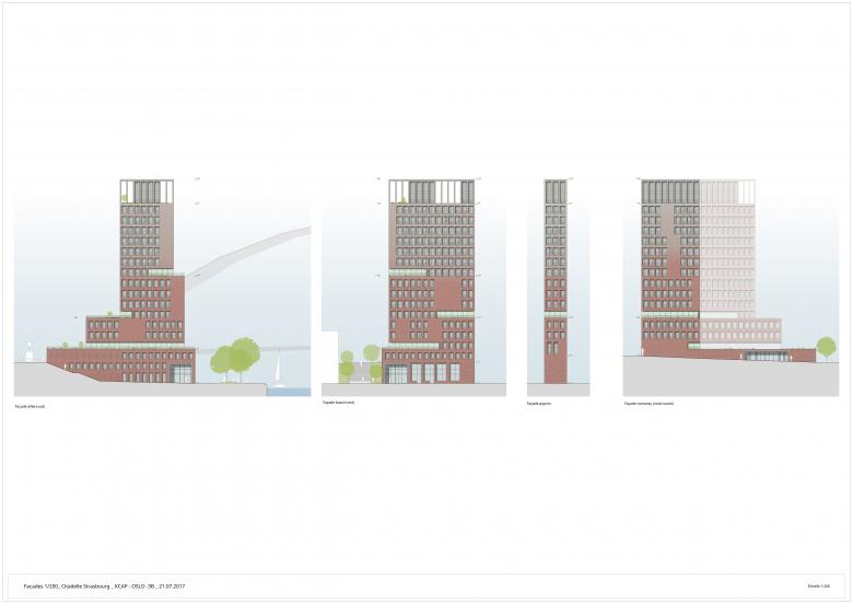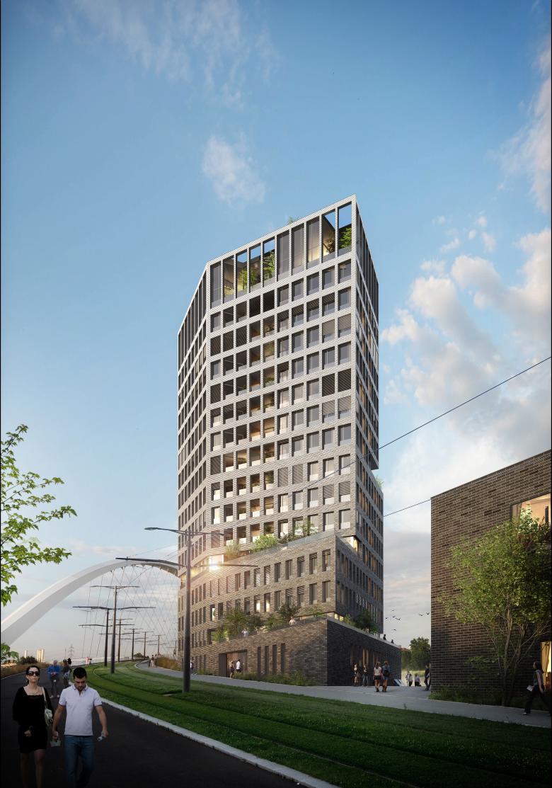 In seinem architektonischen Ausdruck und mit seiner verspielten Ziegelfassade bezieht sich der Entwurf auf den lokalen Kontext des neuen Stadtteils, der durch die Nähe zum Wasser und die Dominanz von Ziegeln definiert ist. Um die Vertikalität und Schlankheit des Turms zu betonen, nimmt der Anteil der Öffnungen in der Höhe zu und die Fassaden weisen nach oben einen Farbverlauf auf.