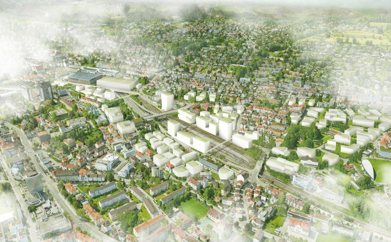 Mit dem Freiraum- und Landschaftskonzept und einer zusätzlichen Fussgängerbrücke über das Gleisfeld werden die heute bestehenden Querbezüge und Verbindungen gestärkt und durch die Nutzung der vorhandenen Freiraumpotentiale des Gerhalden- und Tanneichbach in die Platzgestaltung der neuen Mitte St. Fiden integriert.