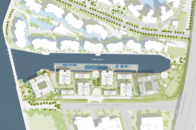 Der städtebauliche Entwurf von King›s Dock Village besteht aus drei Gebäudetypen, dem Courtyard, dem Tower und der Villa, die sich um eine Reihe halböffentlicher Räume mit üppiger Vegetation entlang des King›s Dock gruppieren. Die Gebäude nehmen in der Höhe allmählich ab und folgen dem Aussichtskorridor vom Mount Faber hin zum Wasser. Der Entwurf schafft durch die differenzierten Gebäudehöhen und -grössen eine attraktive Skyline und eine einzigartige Atmosphäre um jedes Gebäude. Das Relief von Gemeinschaftsgärten, Balkonen und Sonnenschutzelementen sorgt für Porosität und Durchlässigkeit. Die Fassaden variieren in ihrer Ausrichtung, Form und der Wahl des äusseren Sonnenschutzes. Sie bilden eine dynamische, doppelte Schicht, die Privatsphäre und Schutz bietet und gleichzeitig zur Kühlung der Fassaden beiträgt. Die Dächer sind als Grünflächen konzipiert, die Regenwasser zurückhalten und als Isolierung wirken. Der Entwurf bietet eine breite Palette von Dienstleistungen für die Bewohnenden und umfasst eine Vielzahl von Grünflächen, einschliesslich einer zentralen Gartenpromenade, die alle Eingangsbereiche miteinander verbindet.
