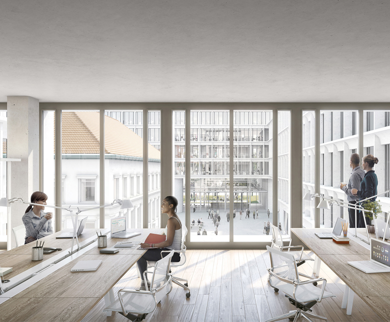 Das Gestaltungskonzept basiert im Wesentlichen auf dem Gedanken, ein Ensemble aus Alt- und Neubau entstehen zu lassen, wobei dem Altbau die Rolle des Akteurs und dem Neubau die des Hintergrundes zukommt. Diese Idee schlägt sich in der zwar charaktervollen aber unaufgeregten Fassadengestaltung des Büroneubaus nieder. Der Massivität und Geschlossenheit des Altbaus wird die Transparenz und Eleganz einer auf die wesentlichen Elemente – den konischen Pfeiler und das konkave Gesims – reduzierten Form entgegengesetzt.
