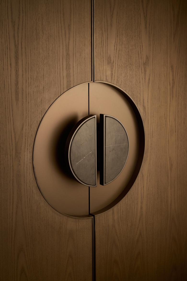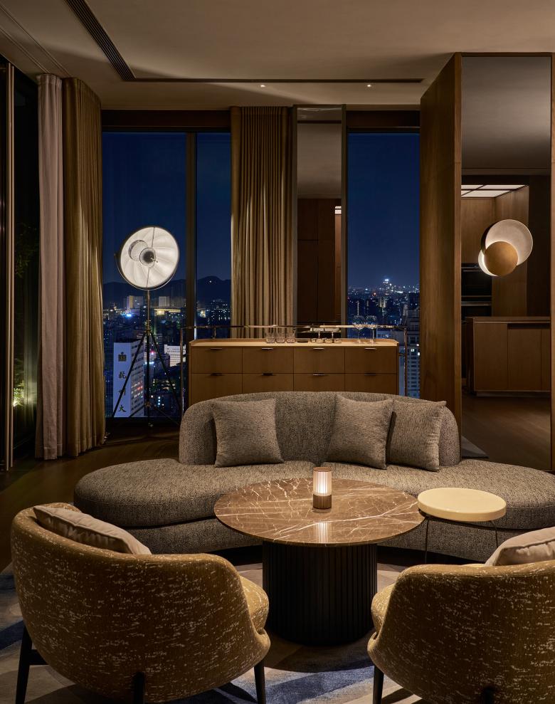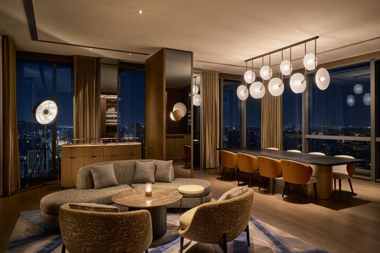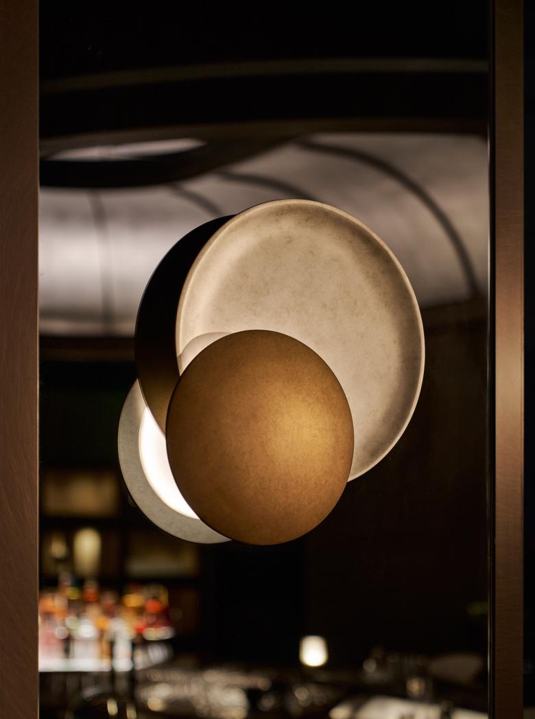 If the terraces embody a communal form of intimacy—inviting quiet conversations beneath the open sky—the Private Dining Room translates this same spirit of seclusion into an indoor setting. Conceived as an exclusive, residential-inspired setting, the Private Dining Room recalls the warmth of the astronomer’s own living room. A mix of lounge seating and dining area opens to corner views of the city, creating a setting that feels expansive and light-filled by day, yet transforms into a cocoon of intimacy as night falls. The atmosphere is enriched by subtle astronomical references, from tactile finishes to thoughtfully placed lamps. Above the dining table, custom-designed pendant lights—formed of overlapping ripple-glass discs inspired by ancient star-gazing instruments—evoke a celestial rhythm, casting a soft, radiant glow reminiscent of starlight in motion.