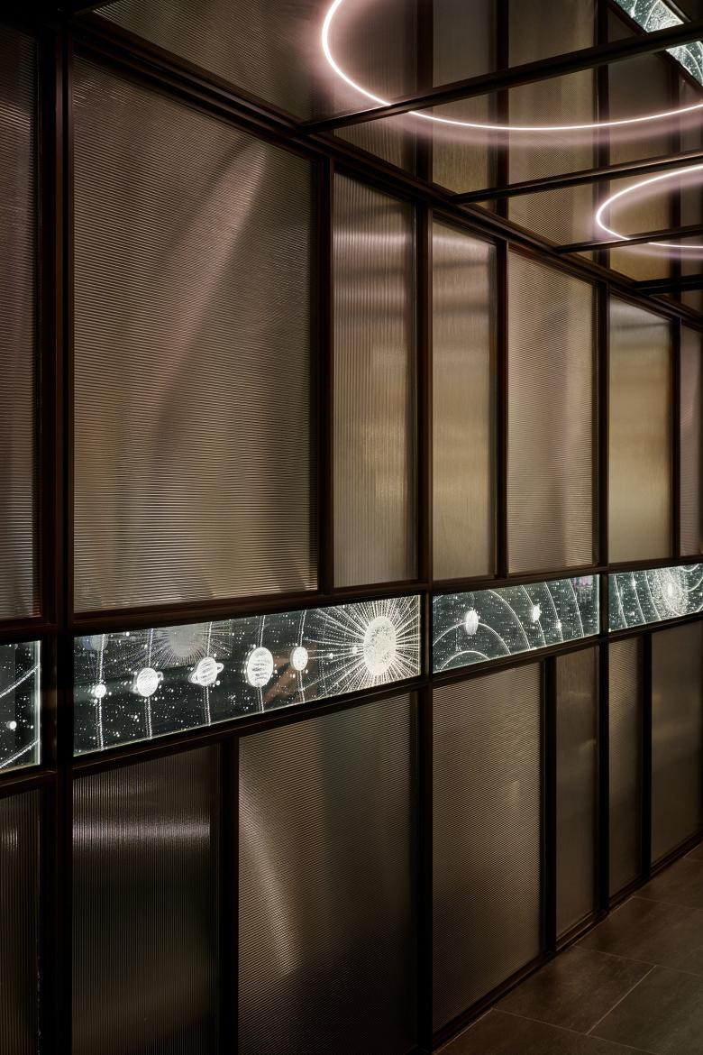 The journey begins at the threshold on the 30th floor, where a polished reception desk with mirrored curves greets visitors beneath a softly glowing backdrop, striking a balance between refinement and anticipation. Beyond it, the corridor acts as a passage into another realm: a mirrored ceiling stretches the perspective while reeded glass walls blur the outlines of the garden outside. Cutting across the surface, a luminous glass “belt” etched with solar system motifs anchors the design with a delicate nod to astronomy. These materials shift in character with time—by day, shimmering with natural reflections that suggest openness and clarity; by night, glowing softly as the circular ceiling light transforms into a floating cosmic feature that ushers guests deeper into the atmosphere of STARS.