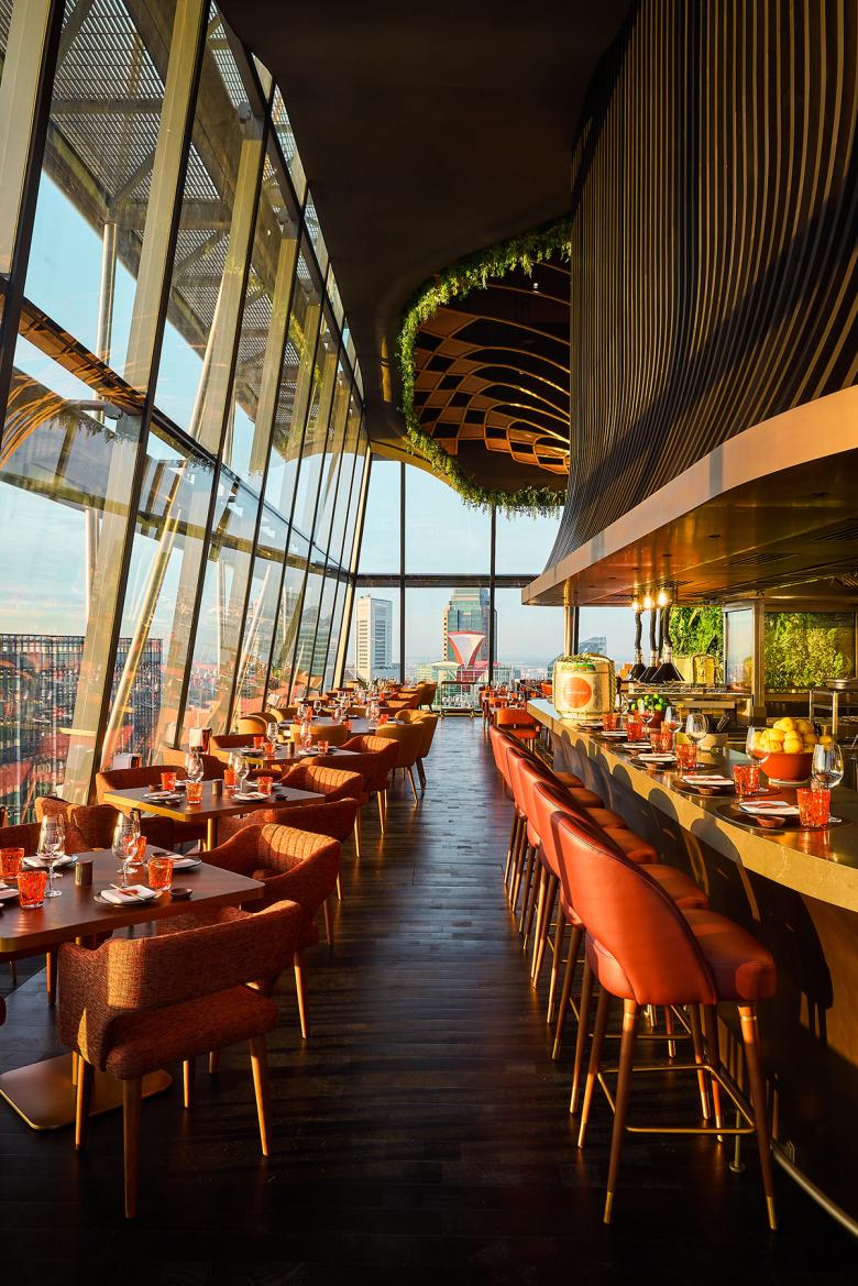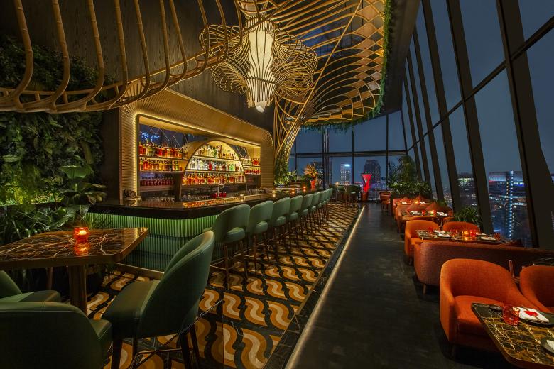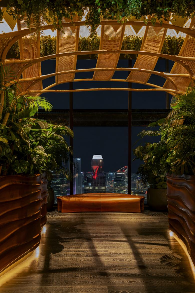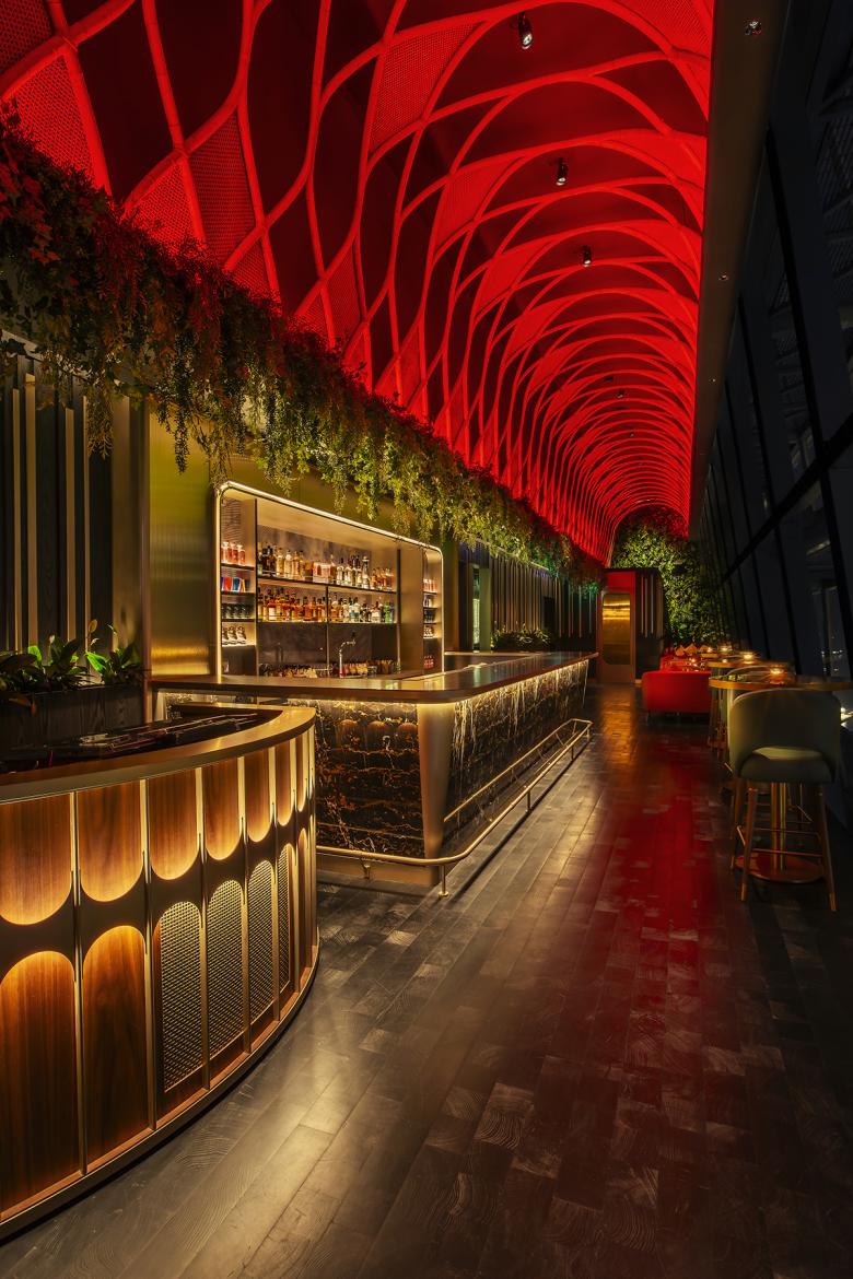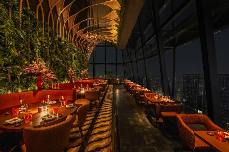 Situated at the pinnacle of Singapore’s iconic Capital Tower, the newest member of the SUSHISAMBA network, masterfully crafted by Kokaistudios, revolutionizes the dining experience by seamlessly blending Japanese, Brazilian and Peruvian cultural elements. SUSHISAMBA merges the essence of these three vibrant cultures through dynamic interiors and signature culinary offerings, providing a distinctive dining adventure across its global cosmopolitan locations. The Japanese aesthetic is reflected in the precise balance, geometric designs, and use of natural materials, while the Brazilian and Peruvian influence shines through in the vibrant colors, bold textiles, and exuberant finishes.
