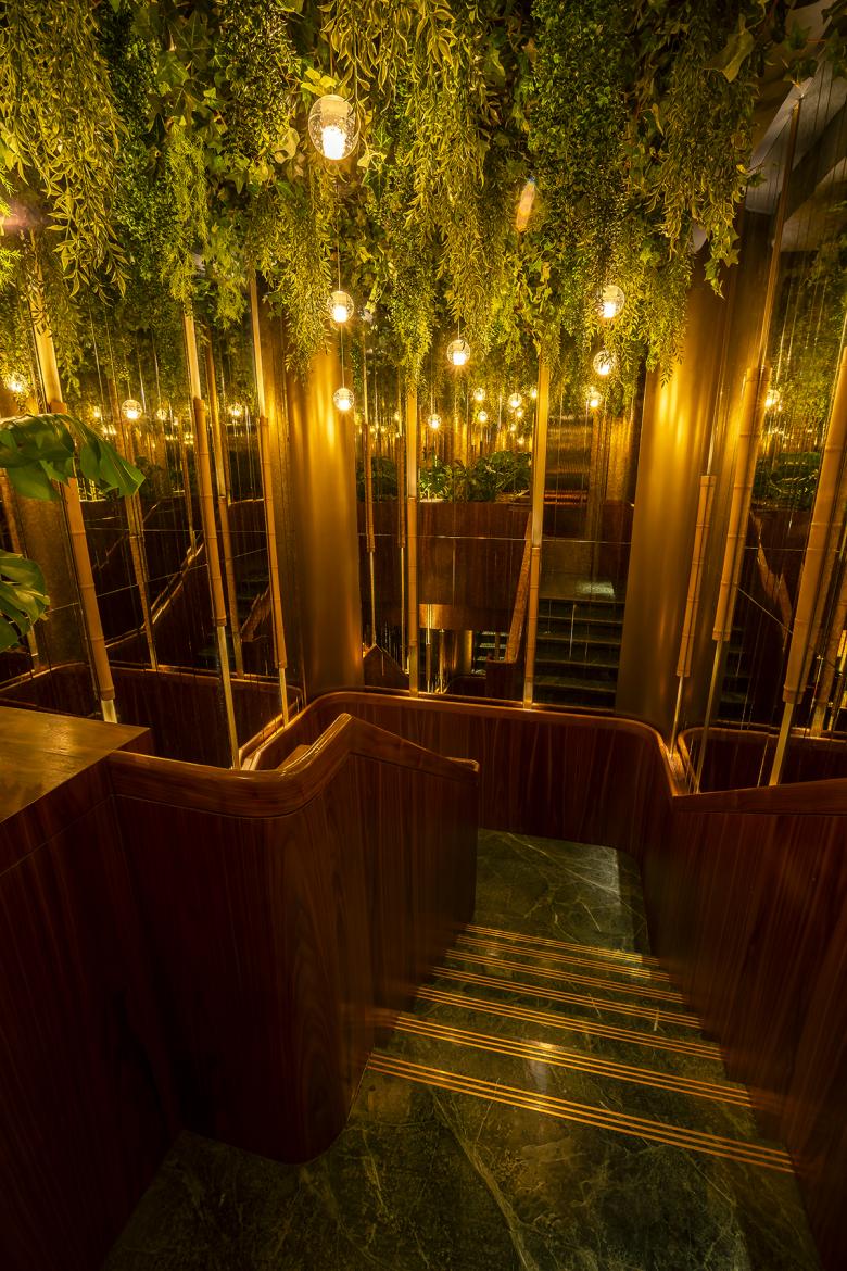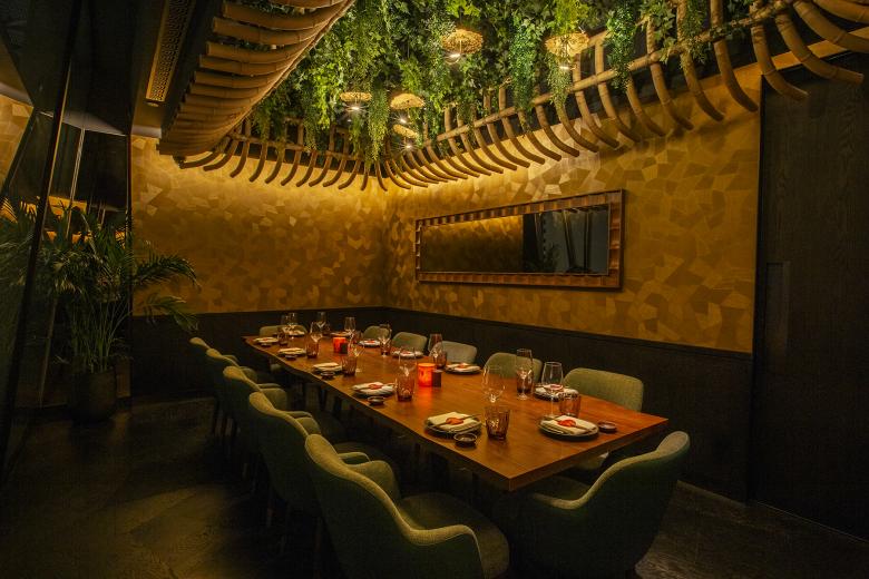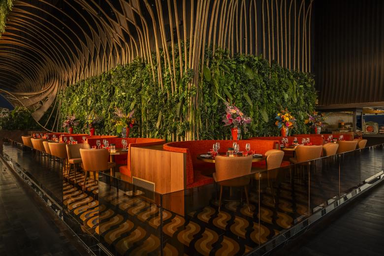In keeping with the design language established at SUSHISAMBA in Dubai, this space features an impressive 3D-printed bamboo vaulted ceiling, soaring to a dramatic height of 8.5 meters, which envelops the entire area in an organic, natural feel. A lush green wall and hanging greenery contribute to the tropical ambiance. The lively atmosphere of the venue is anchored by a statement bar and an open kitchen counter, which are enhanced by vibrant colors and layered patterns.