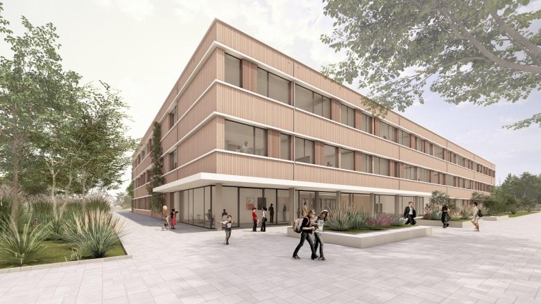 Die Mensa als zentraler Ort, mit Betreuungsräumen für die Grundschule, vervollständigt das Schulzentrum. Als erster Baustein erfolgt die Errichtung des Gymnasiums in Holz-Hybrid-Bauweise