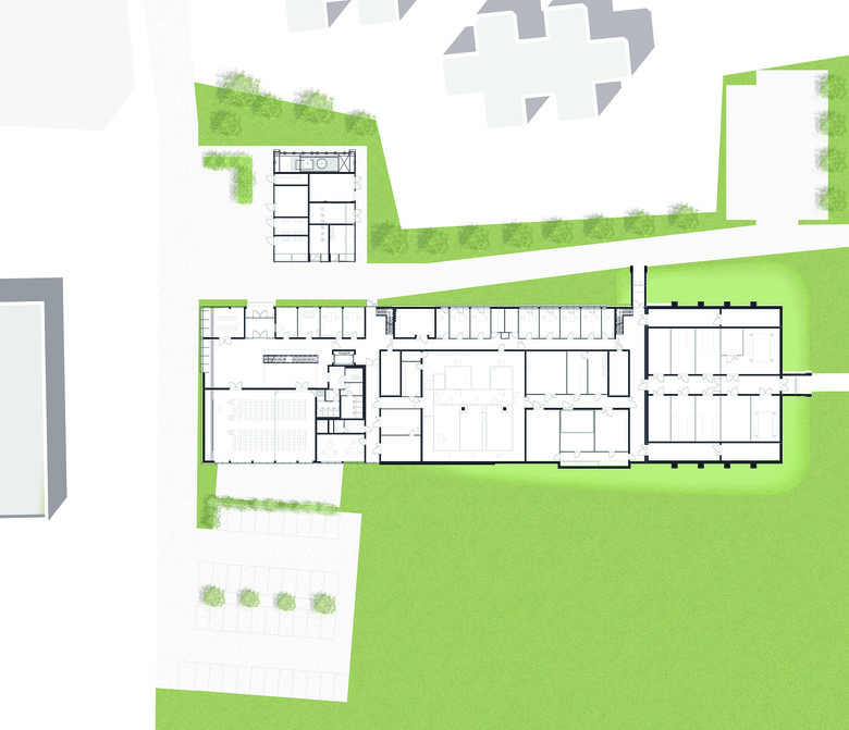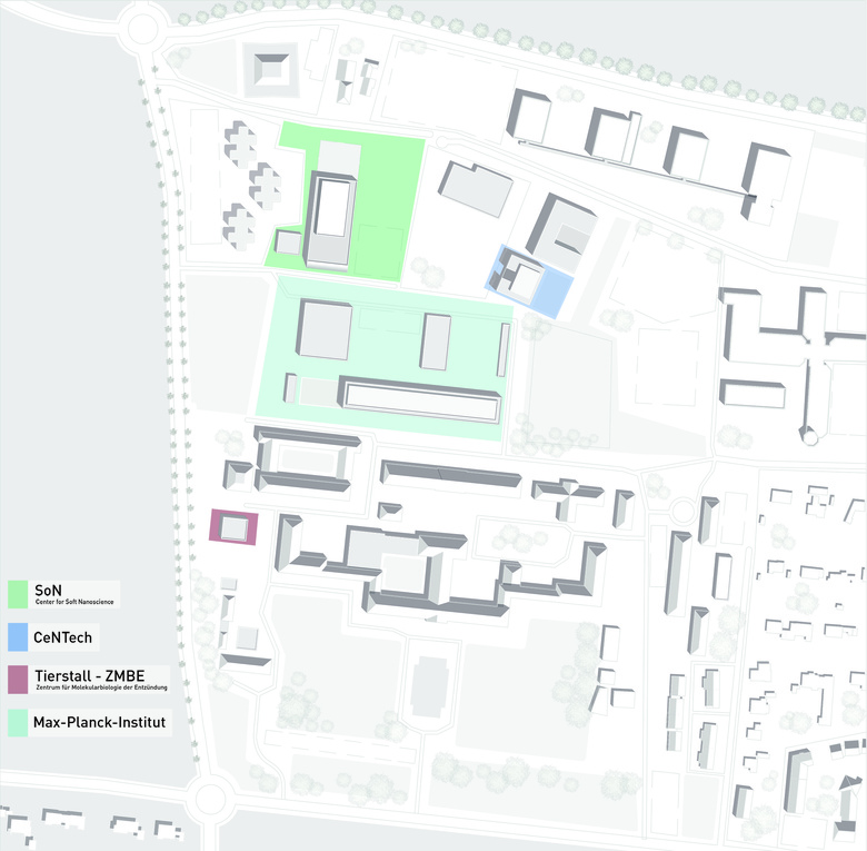 Das Umfeld des Forschungsgebäudes ist geprägt durch eine heterogene, bauliche Struktur ohne eindeutige städtebauliche Bezüge. Daher wurde der Leitgedanke des Entwurfs nicht aus dem städtischen Kontext, sondern aus der wissenschaftlichen Nutzung entwickelt. Ziel ist es, den besonderen Anforderungen aus der wissenschaftlichen Nutzung durch eine differenzierte, aber stark funktional ausgerichtete Gebäudestruktur zu entsprechen. Durch geringe baukörperliche Eingriffe entsteht dennoch ein eigenständiger, unverwechselbarer Baustein, der sich in seinem Umfeld zu behaupten weiß.