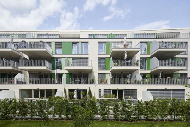 Der Gebäuderiegel mit der hochwertigen Natursteinfassade erstreckt sich über 5 Ober- und ein Untergeschoss und beherbergt 44 Eigentumswohnungen.