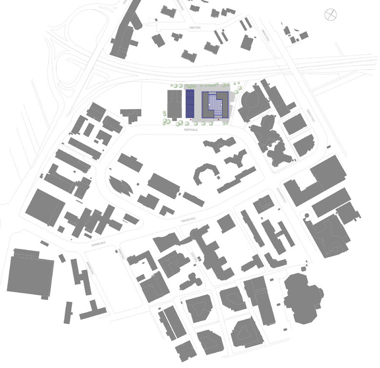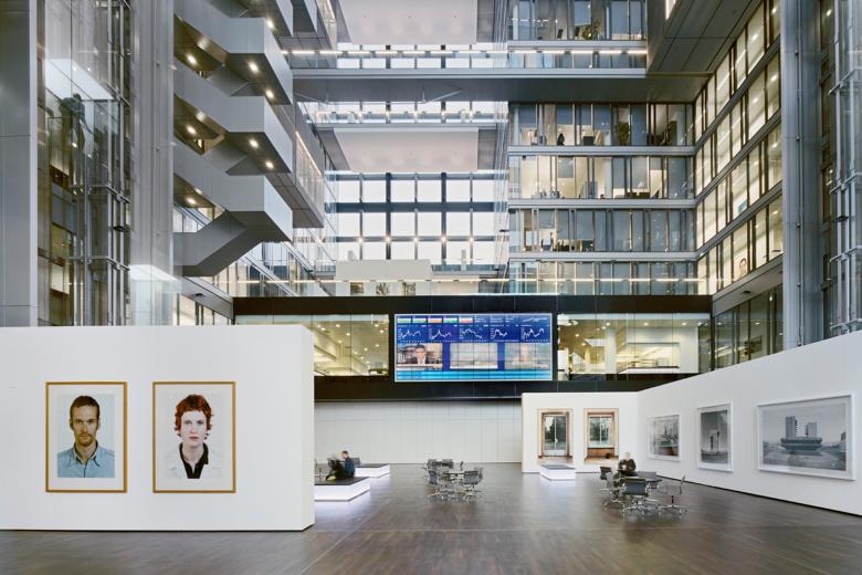 Der 87 Meter hohe Kubus markiert weithin sichtbar den neuen Standort der Deutschen Börse. Zwei L-förmige Baukörper, die punktsymmetrsich zueinander angeordnet sind, umschließen die zentrale, rund 80 Meter hohe Eingangshalle. Vernetzt durch Brücken, Stege, Treppen entsteht ein dreidimensionaler Kommunikationsraum mit vielfältigen Sichtbeziehungen.