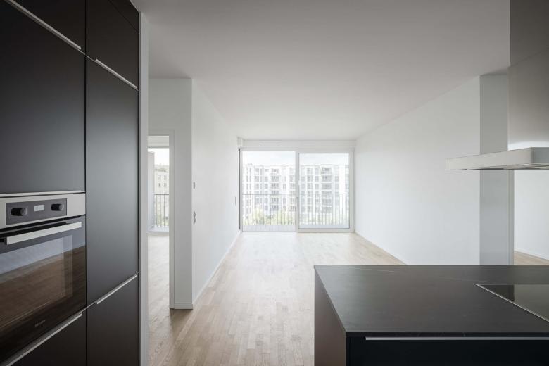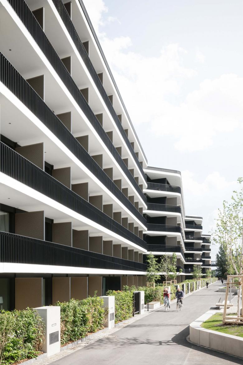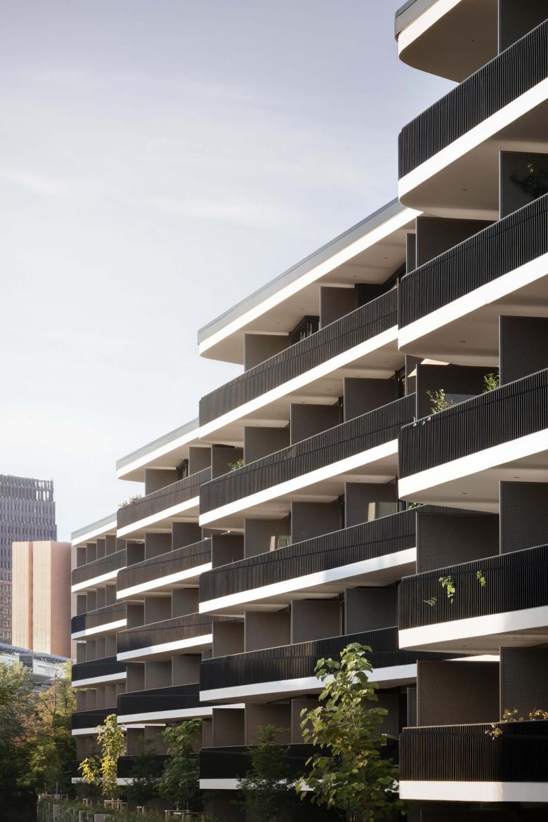 Die neue Wohnbebauung ersetzt den westlichen Teil des Parkhauses am Gleisdreieck in Berlin-Mitte, das entlang der Gleise der Stadtbahn U2 zur Hälfte zurückgebaut wurde. Der 185 Meter lange Wohnkomplex, der sich in vier Einzelbaukörper gliedert, ergänzt den Bestand und wird durch Lichthöfe vom Parkhaus abgerückt. Diese ruhigen, lichten, grünen Höfe sind gemeinschaftlich nutzbar und schirmen die Wohnungen gegen äußere Einflüsse ab. Die schräggestellten Fassaden der Einzelhäuser wenden sich mit markanten, geschwungenen Balkonen zur Sonne hin und gliedern auf dynamische Weise das Gebäudevolumen. So erhält das Ensemble eine starke Identität. Die 178 Wohnungen sind unterschiedlich groß, doch eines haben sie alle gemeinsam: Sie sind mit einer Terrasse oder einem Balkon ausgestattet. Im Erdgeschoss befinden sich familienfreundliche Maisonettes mit Garten. Die exklusiven Penthäuser im fünften Obergeschoss verfügen über eine großzügige, begrünte Dachterrasse mit Blick über den Park. Viel Licht und zahlreiche Bezüge zur Natur schaffen besonders hochwertige Wohnungen anstelle des ehemaligen Parkhauses.