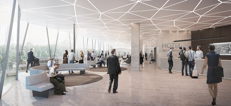 Der Entwurf sieht einen markanten Turm vor, der sich mit seiner eigenständigen Architektur zwischen den Brücken und dem EZB Doppelturm behauptet. Das Gebäude ist auf Grund seiner weiten Sichtbarkeit über die Mainufer hinaus prägend für die Skyline. Auf einer Fläche von 26.000 qm (BGF) sind neben 300 Hotelzimmern bis zum 12. Obergeschoss weitere 120 Gästezimmer in den oberen Geschossen vorgesehen. Als Highlight ist im 12. Obergeschoss ein öffentliches Zwischengeschoss mit Panorama-Bar vorhanden. Die Glasfassade legt sich wie ein Vorhang in Falten über die Gebäudefigur und ermöglicht den Gästen beeindruckende Ausblicke über das Mainufer und die Frankfurter Skyline.
