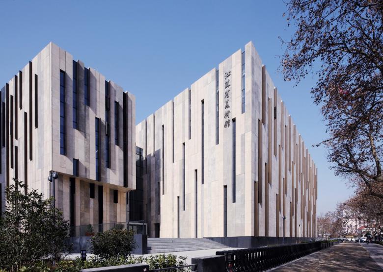 Im kulturellen Zentrum Nanjings gelegen, zählt das neue Jiangsu Provincial Art Museum zu einem der bedeutendsten Ausstellungshäuser im Südosten Chinas. Die beiden ineinander verschränkten Baukörper formen einen Zwischenraum, der als Eingangshalle öffentlich zugänglich ist und zwischen aufstrebenden Natursteinwänden lediglich von oben belichtet wird. Die weitgehend geschlossene Travertin-Natursteinfassade mit schmalen, vertikalen Fenstereinschnitten betont den monolithischen Gesamteindruck des Ausstellungsgebäudes.