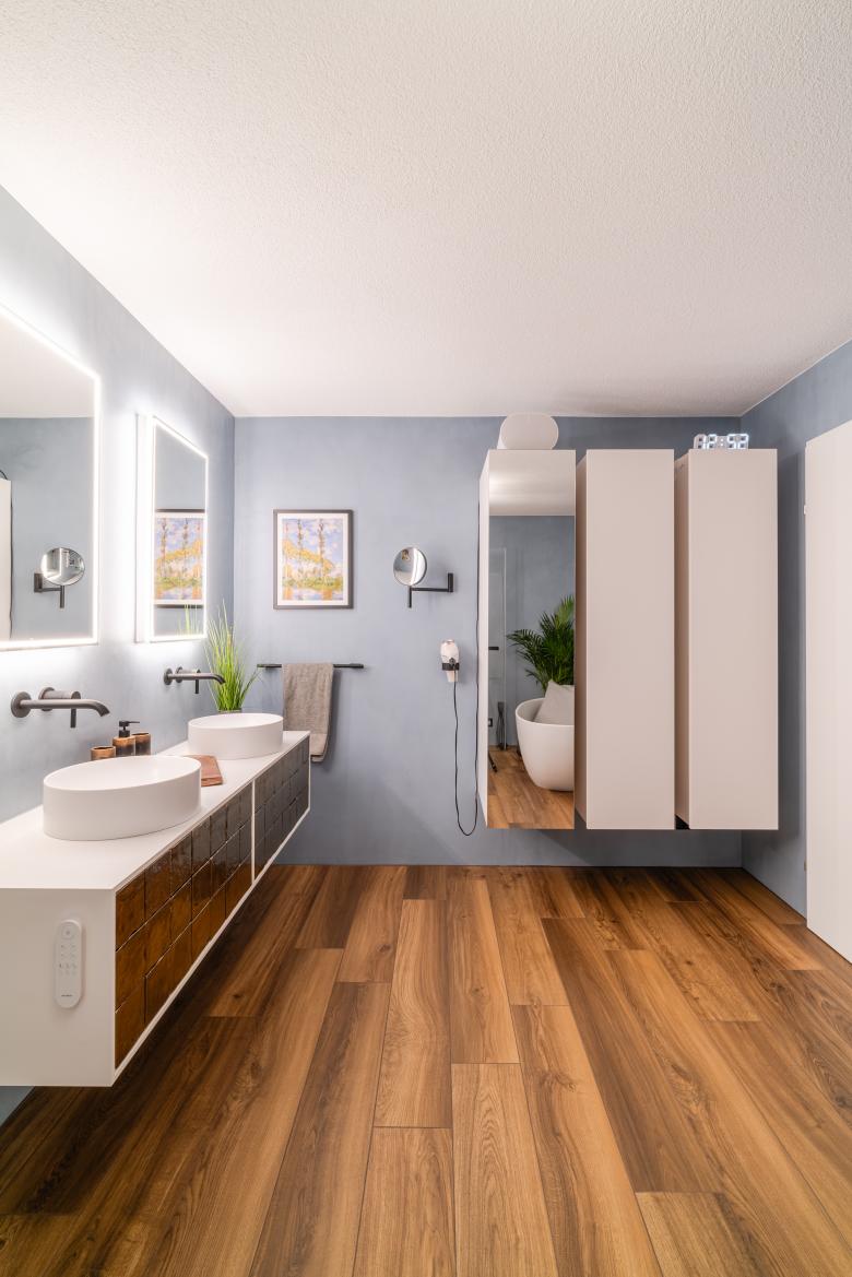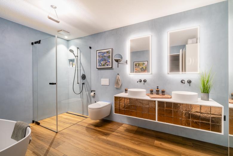 Bereits rund zwei Jahre vor der eigentlichen Ausführung wurden die ersten Entwürfe erstellt. In enger Abstimmung mit den Badberaterinnen und Badberatern von Pura Bagno entstand ein individuelles Raumkonzept. Besonders wichtig war die harmonische Einbindung des Badezimmers in das Gesamtkonzept der Wohnräume.