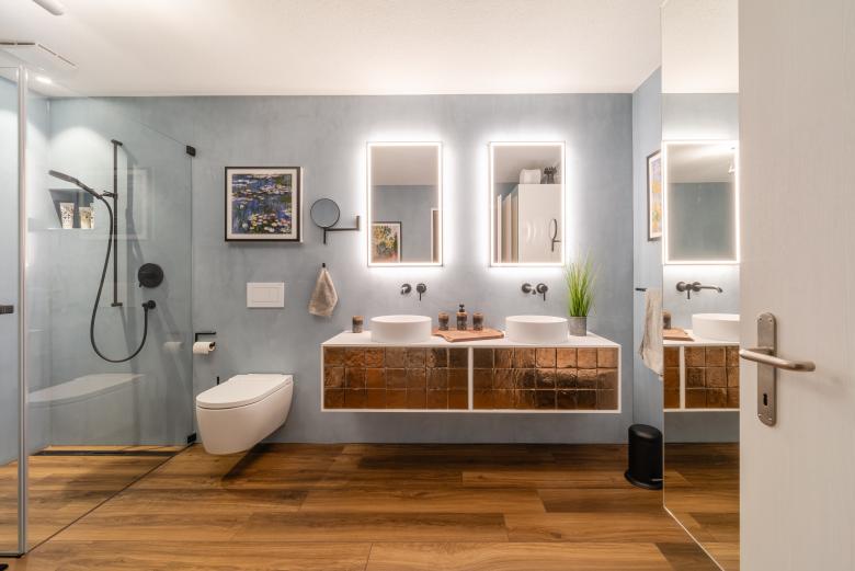 "Dank der frühzeitigen Planung und der sorgfältigen Produktauswahl konnte ein modernes Badezimmer realisiert werden, das höchsten Ansprüchen an Komfort, Design und Qualität entspricht — und optimal auf die Bedürfnisse der Bauherrschaft abgestimmt ist."