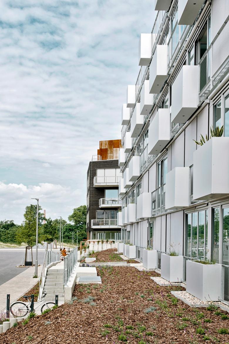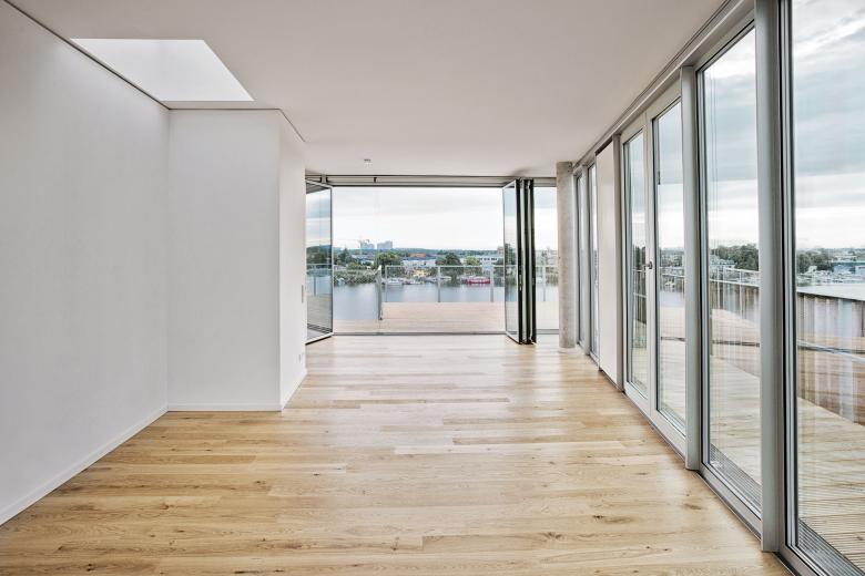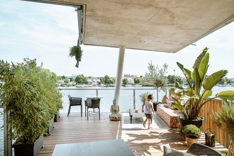 Alle Wohneinheiten des Bauwerkes sind durchgesteckt konzipiert und verfügen damit jeweils über zwei Himmelrichtungen: der Nord-Ost gelegenen Steganlage und einer Südseite, welche mit großformatigen Pflanztrögen zu freien Bepflanzung durch die Bewohner ausgestattet ist. Damit müssen die Bewohner weder auf die bemerkenswerte Aussicht zur Dahme im Nord-Osten noch auf eine lichtspendende Süd-West-Seite verzichten. Mittels großzügiger Falt-Schiebewände können die Wohnungen maximal zu den Außenräumen geöffnet werden – Innen und Außen verbinden sich so zu einer Einheit und die gesamte Tiefe des Steges wird zum integralen Bestandteil der Wohnlandschaft.