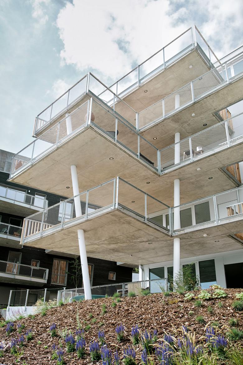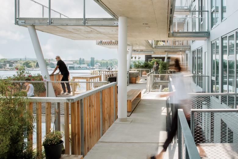Eine großformatige, acht Meter tiefe Steganlage vor dem eigentlichen Gebäude führt die einzelnen Wohnungen ganz nahe zum Wasser – so dass Wohnung und Wasser scheinbar miteinander verschmelzen. Der Steg ist ein Hybrid aus privaten Balkonen bzw. Freiräumen und gleichzeitig Erschließungselement. Damit steht der Steg für Aussicht, Freizeit, Erholung, Vergnügen, Genuss aber auch für soziale Interaktion, Gemeinschaft und Wir-Gefühl. Er „stegt“ für eine Art Badeseeeffekt.Man kann sagen: Dieser Steg IST das Gebäude, denn er prägt das Haus visuell und auch inhaltlich. Er ist gleichzeitig Gesicht und Seele des Bauwerkes.