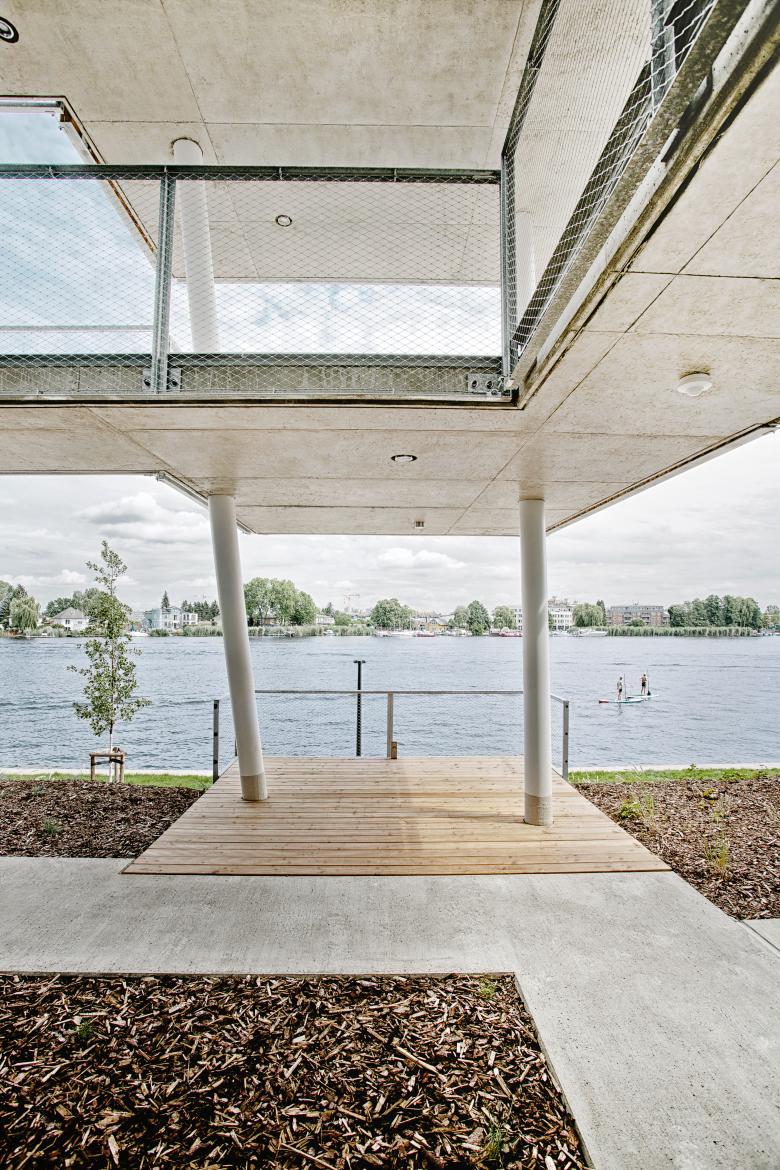 Das Bauwerk mit seinen 28 Wohneinheiten im Berliner Stadtteil Grünau verfügt über vier Vollgeschoße und ein Staffelgeschoß. Im Zentrum des Hauses befindet sich die Vertikalerschließung, welche direkt mit dem Steg verbunden ist. Der ca. 2m vom Haus abgesetzte Steg führt dann die Bewohner nicht nur direkt in ihre Wohnungen sondern auch zu ihren großzügigen Freibereichen mir ihrer spektakulären Aussicht über den Fluss. Die einzelnen Ebenen des Steges verfügen über unterschiedliche Grundrisslayouts. So ergebt sich neben den vielfältigen vertikale Blickbeziehungen auch ein interessante und immer wieder neue Schattenspiele.