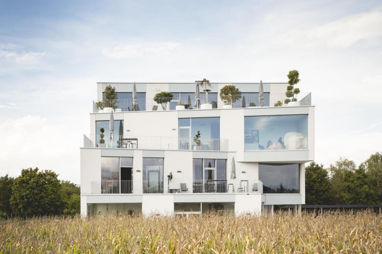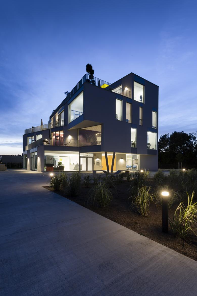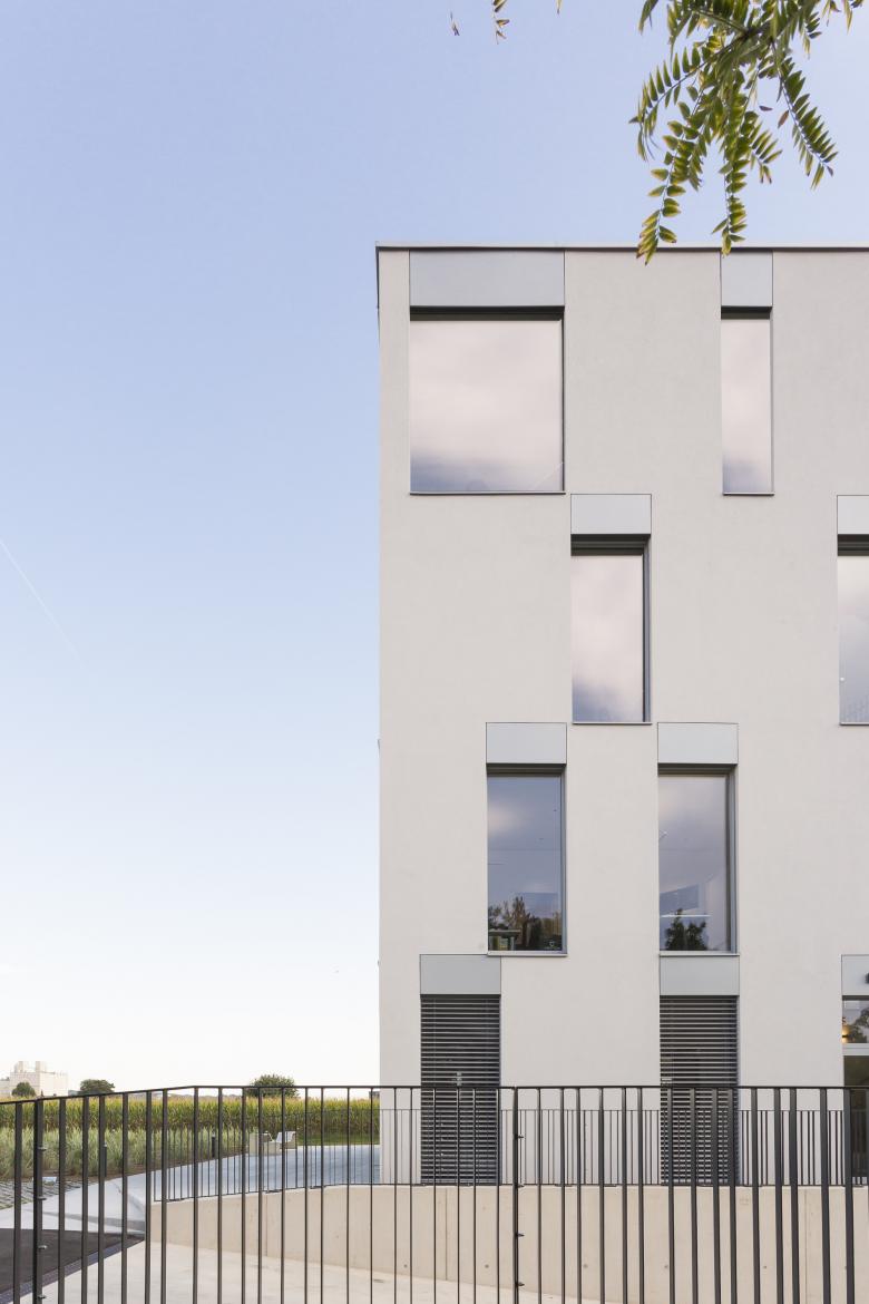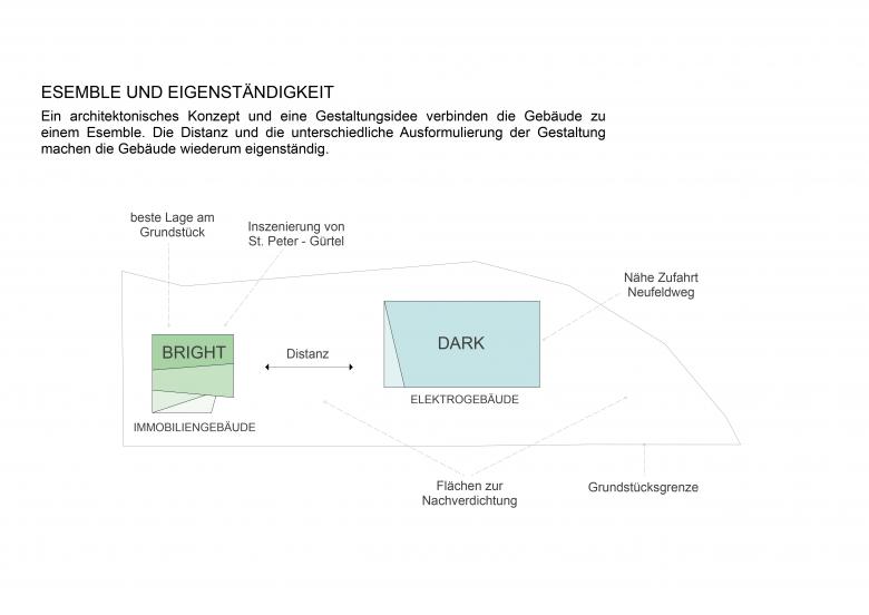 Dennoch ist ein Gebäude Schwarz, das andere Weiß, eines ist ein Büro, eines ein Gewerbeobjekt ein Gebäude schraubt sich in die Höhe, das zweite ist Flach. Zwischen den beiden wird Steppengras gepflanzt. Ein Maximum an Distanz, Zwischenraum, Souveränität und Identität entsteht. Es ergibt sich eine Art Mini-Ensemble aus zwei im Dialog stehenden Gebäuden auf einem Grundstück.