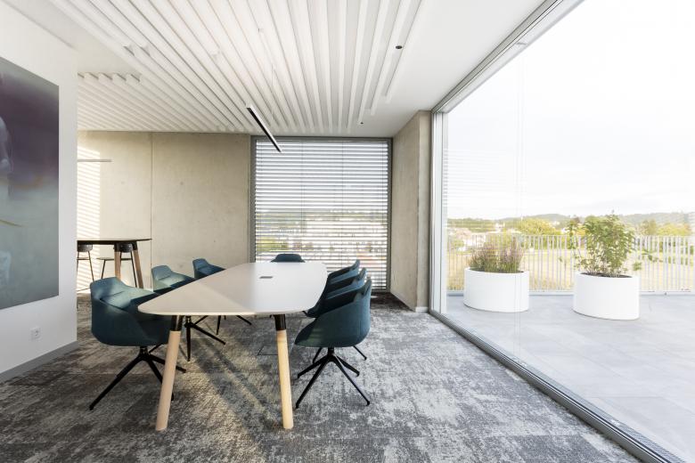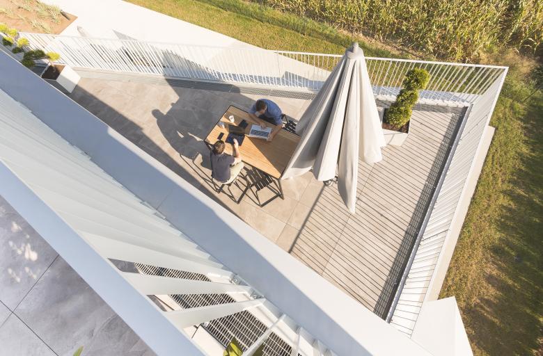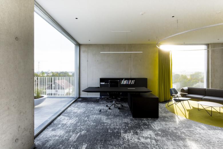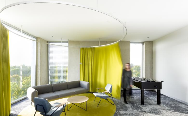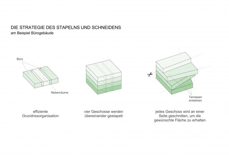 Die fast zufällig wirkenden Schnitte führen dazu, dass in jeder Gebäudeebene ein anderes Verhältnis zwischen dem Gebäudeinneren und dem als Terrasse nutzbaren Gebäudeaußenraum entsteht. Die Innenflächen werden dabei räumlich so offen wie möglich gehalten, die Außenflächen dienen als logische Erweiterung bzw. Komplettierung dieser Arbeitslandschaften.