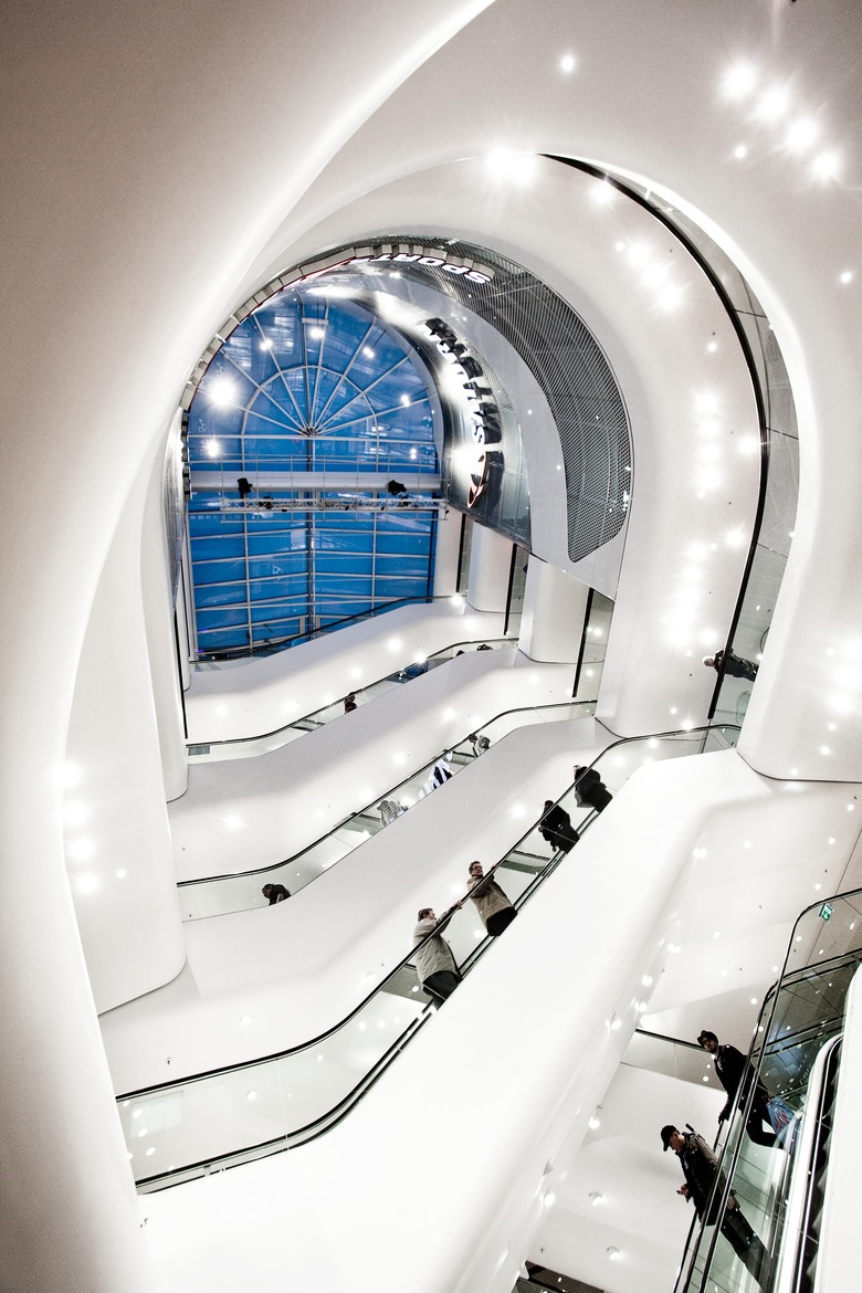 Dafür wurde zunächst das bestehende Atrium mit seiner Roltreppenerschließung aufgewertet. Dieses bildet die neue Mitte des Hauses und ist zentraler Orientierungspunkt des Centers. Von hier aus entwickelt sich ein klar lesbares, sternförmiges Wegekonzept. Das Atrium: perspektivische Öffnung nach oben Die Geschoßdecken wurden abgerundet und nach oben „gerollt“. Das Atrium veitet sich in Richtung der Verkaufsebenen auf und erscheint größer und offener. Atrium und Verkaufsbereiche beginnen miteinander zu verschmelzen: das ganze Center wird zum räumlichen Kontinuum.