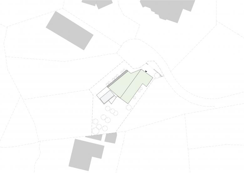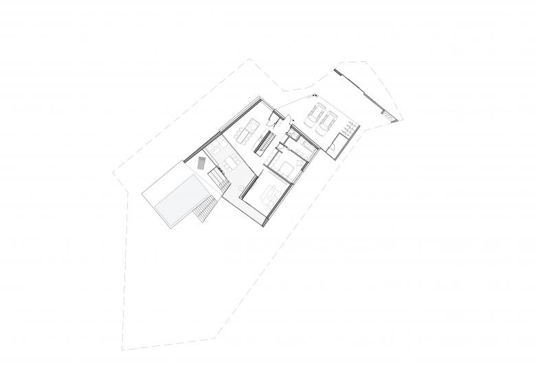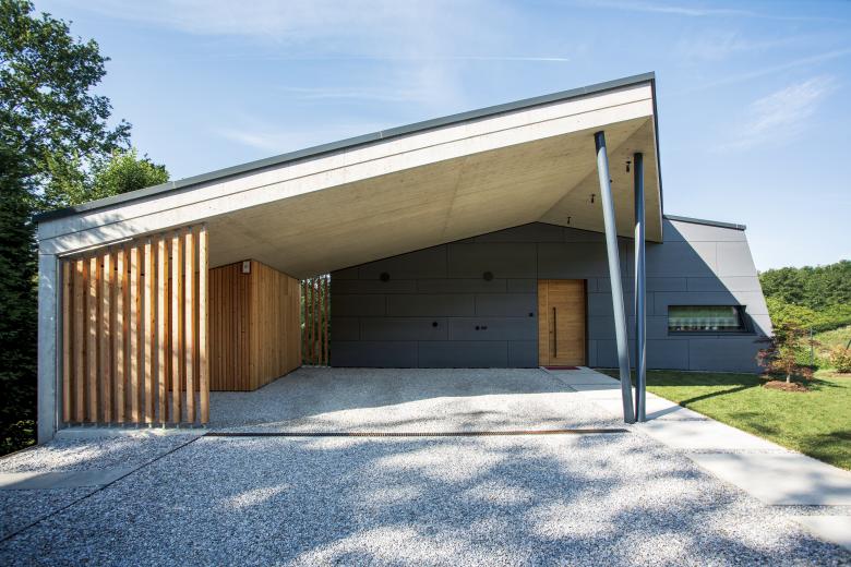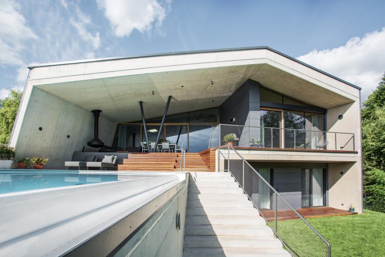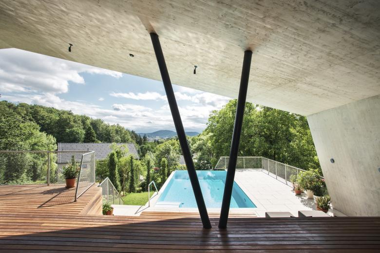 Ein relativ steiles Hanggrundstück mit herrlichem Ausblick über Graz und der Wunsch nach Verbindung von Haus und Garten waren die Vorgaben des Entwurfes der Villa P. Die Grundidee war dem Hang mit einer Abfolge von Ebenen in seiner Topografie zu folgen, auf welchen sich die Villa mit ihren Räumen, Zonen, Außenbereichen und auch Terrassen und Pool entfalten kann. Der Eingang und die Zufahrt erfolgen über den Vorbereich und der Carport am oberen, schmalen Ende des Grundstückes. Die oberste Ebene, ganz auf die fantastische Aussicht gerichtet, beherbergt die Wohnräume, Wohnküche und den Elternbereich mit Elternschlafzimmer und Bad.