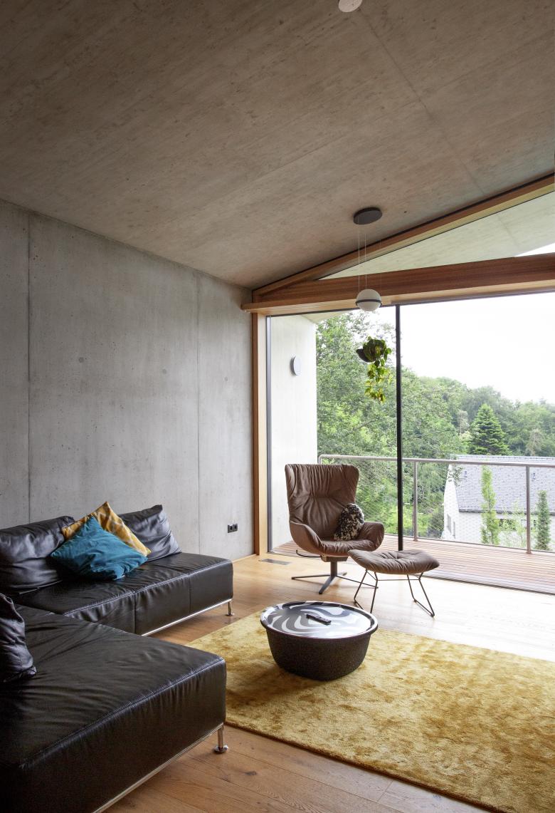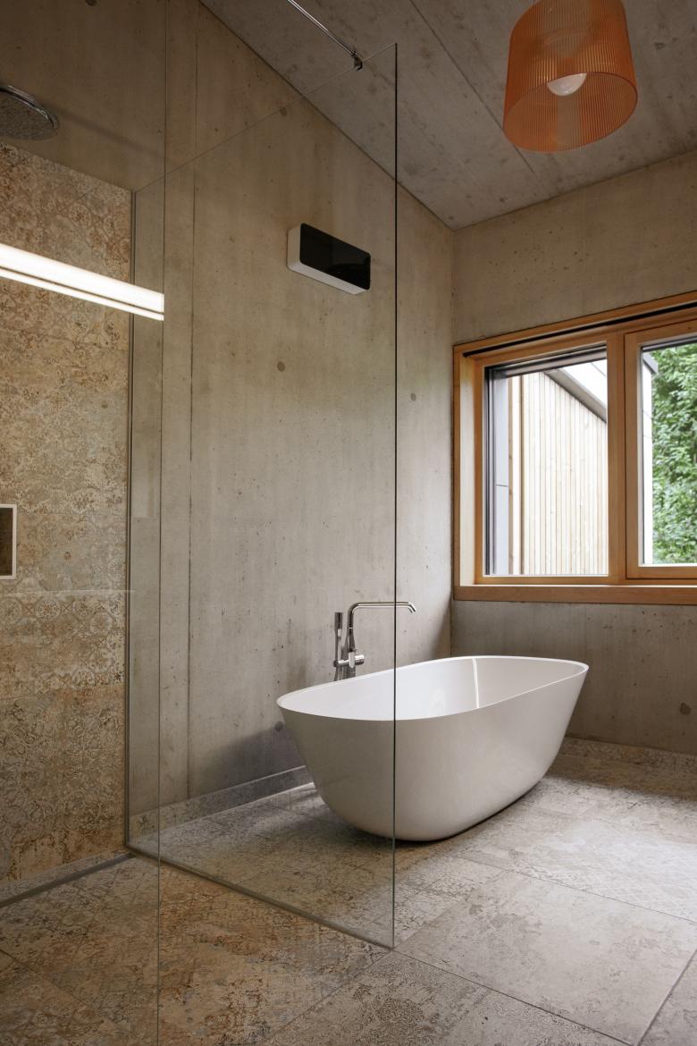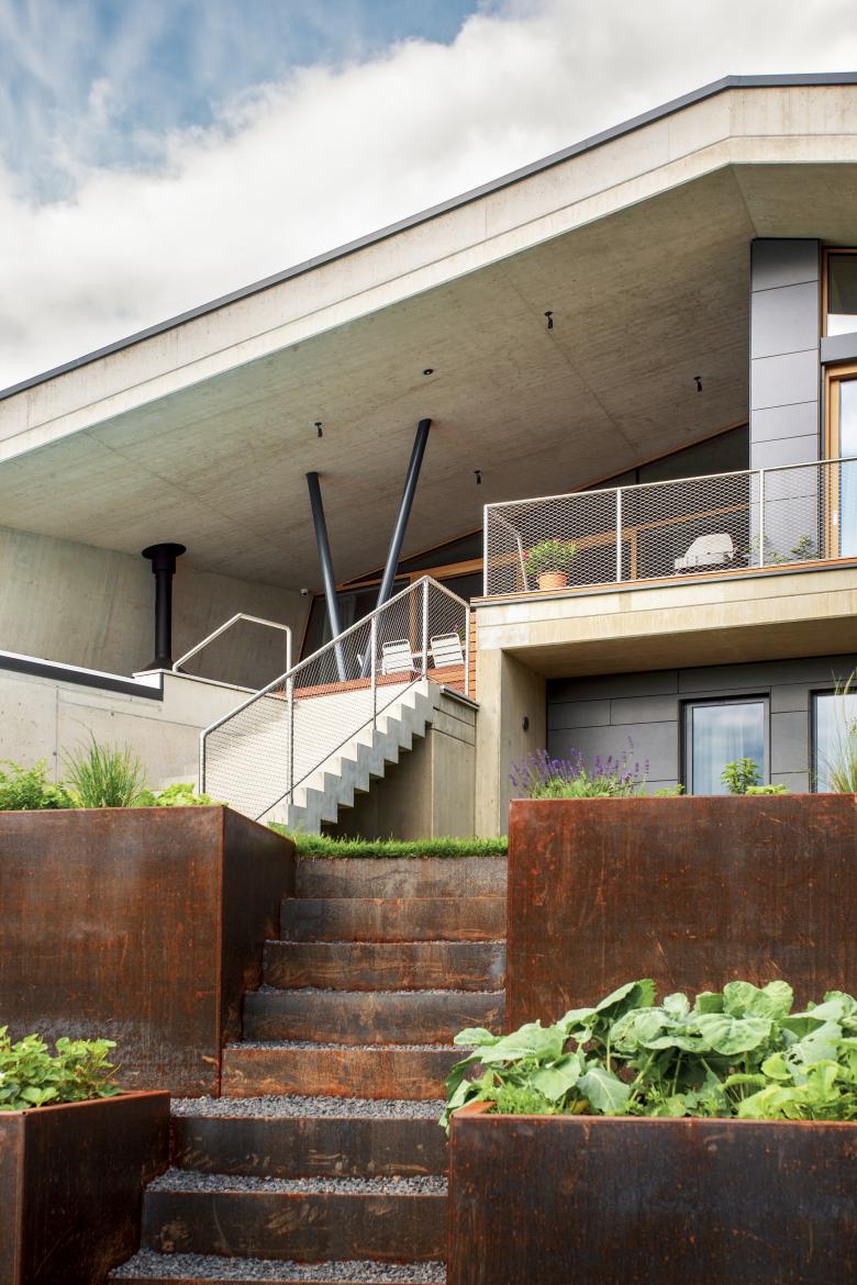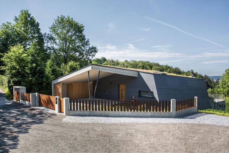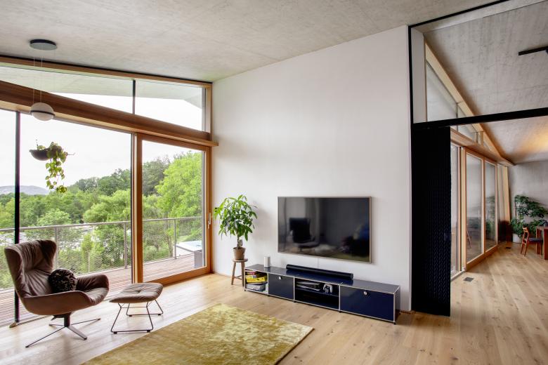 Die Verwendung möglichst roher und natürlicher Materialen mit hoher haptischer Qualität wie Holz und Sichtbeton waren uns wichtig. Auf dem Dach wächst eine Blumenwiese.