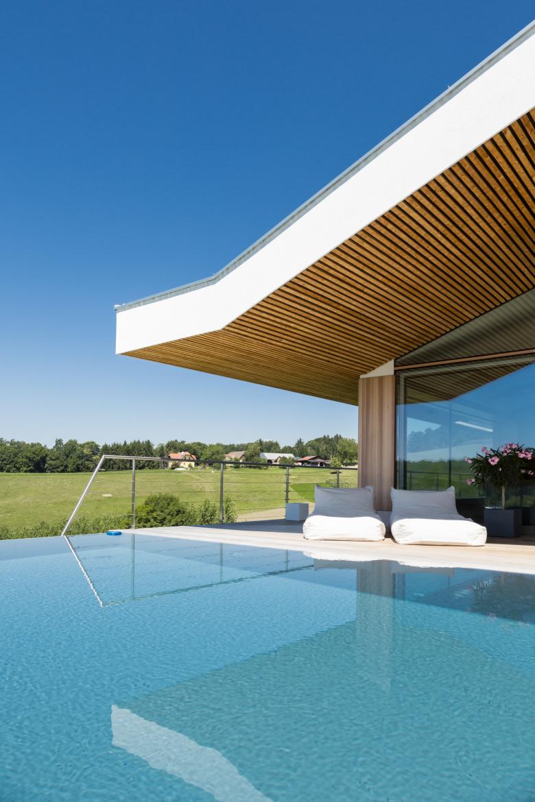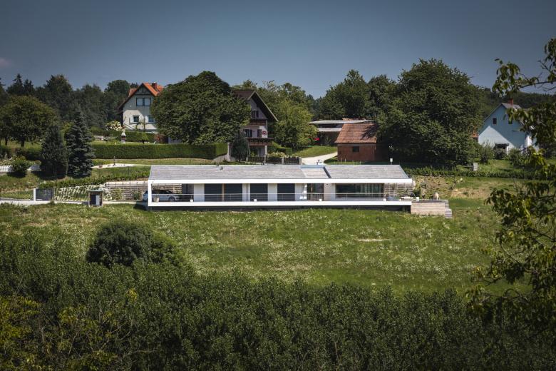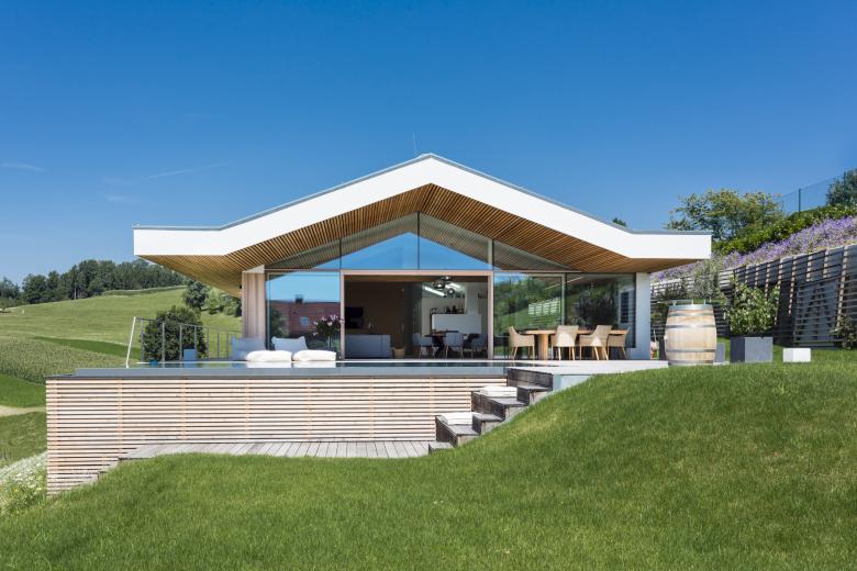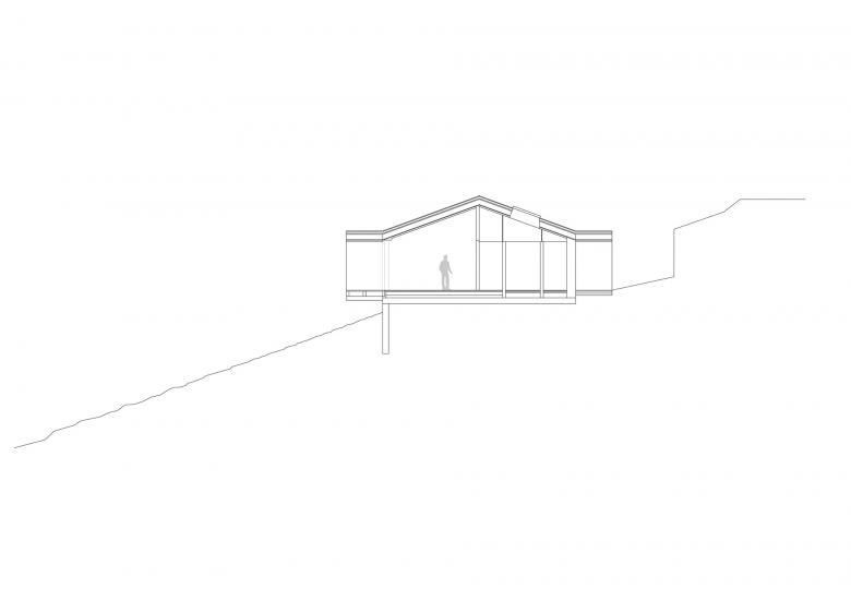 Das Haus ist wie eine Aussichtsplattform am Hang konzipiert: Ein Einschnitt im Hang bildet eine Plattform, eine Fläche auf der sich das Haus entfalten kann.
