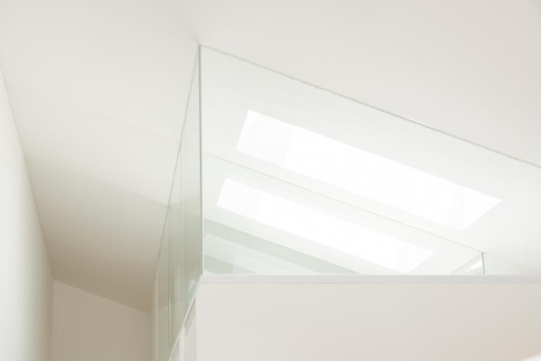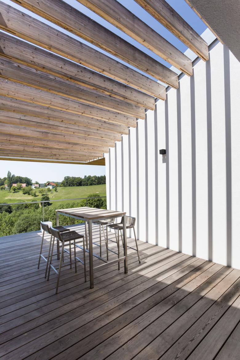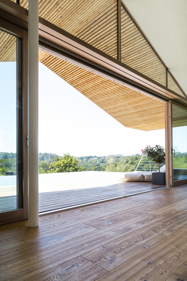 Diese Plattform überspannt zum Teil ein sehr großes markantes Steildach, eine moderne Interpretation der traditionellen Wirtschaftsgebäude der Umgebung, und bildet so das eigentliche Haus.