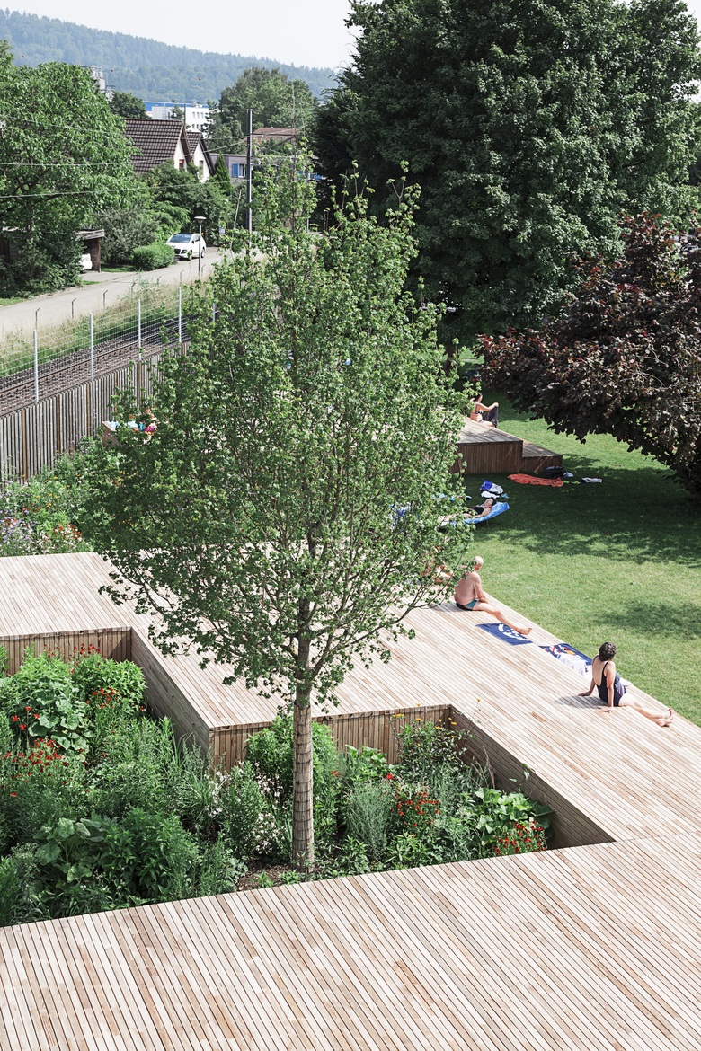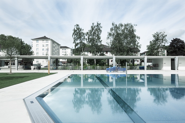 Die Umgestaltung schafft mehr Weite und Grosszügigkeit. Einzelbauten weichen einem durchlässigen Gebäuderiegel. Er strukturiert die Fläche, beruhigt, teilt den Freiraum in eine aktive Badeseite und einen ruhigeren Liege- und Parkteil. Der wertvolle Baumbestand wird integriert und ergänzt. Leicht erhöhte Holzdecks überblicken die Becken und schaffen die Gelegenheit zum «Sehen und gesehen werden».