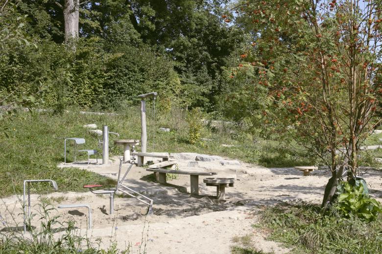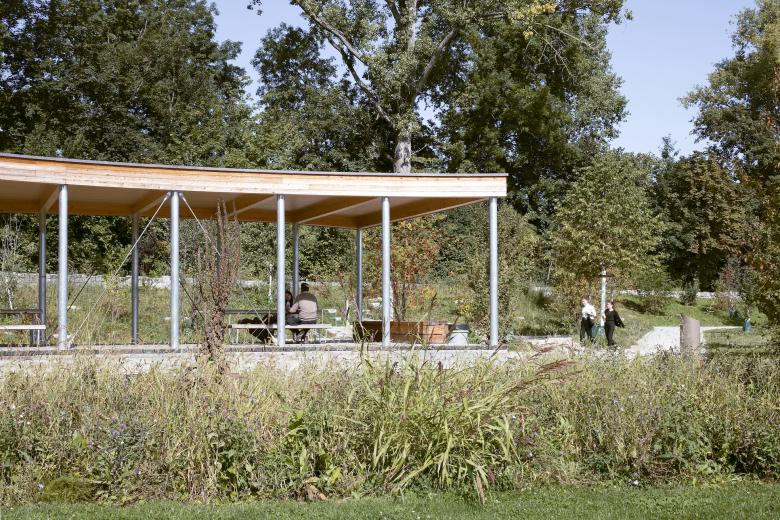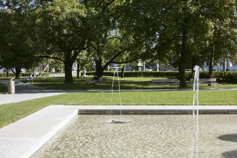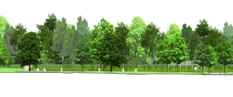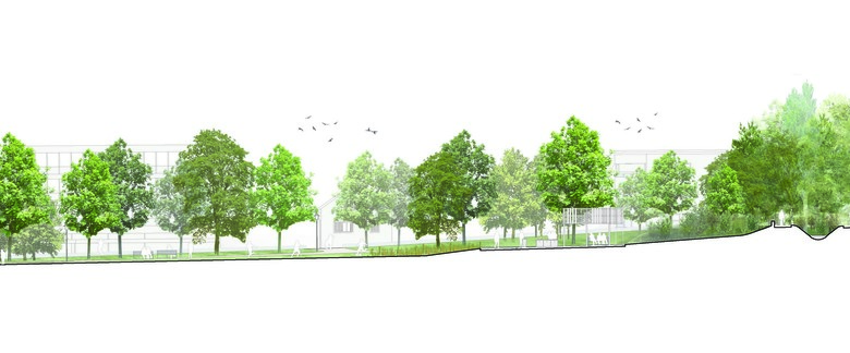 Ein unprätentiöses, unaufgeregtes Projekt, dessen Entwicklungspotential sich erst auf den zweiten Blick offenbart. Bachraum und Dammweg als abfallender Uferbereich werden neu gestaltet. Bisheriger Baumbestand und neue Bepflanzung greifen ineinander. Wegeführung und Bäume formen zwei unterschiedlich grosse Parkwiesen. Der Verkehrsraum der Baslerstrasse erscheint weit weg.
