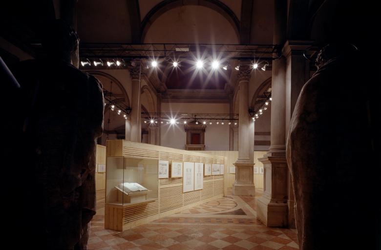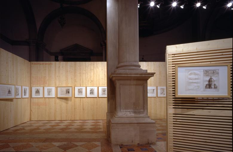The fact that the entire series was unbound offered the opportunity to design a “walk” through the pages of a book. For this reason, one of the first choices was to regulate, apart from the five large floor plans of the Church S. Pietro, the height of the frames containing the prints. Originally these were of different lengths. We equalized the distance between the different pages, thus forming a large ribbon – a kind of continuous and homogeneous strip taking us through the development of the exhibition. This allows the explanatory text, printed directly onto the wooden panels behind the images and organized by section, to help the visitor identify the different parts of the Treatise.