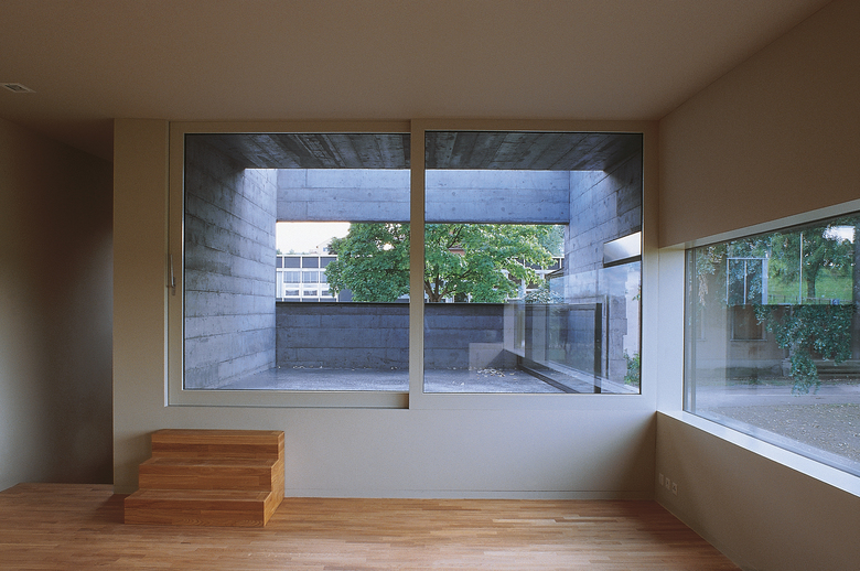 Die Anlage versteht sich als kompakter Gebäudekomplex, welcher in seiner ruhigen, kraftvollen Erscheinung die historischen Anlagen Kloster und Friedhof würdevoll ergänzt und die neue Mitte, das Gemeindezentrum Münsterlingen, symbolisiert. Der architektonische Ausdruck des Gebäudes wird durch eine mit verschieden breiten, rohen Brettern verschalte, schwarz eingefärbte Betonfassade charakterisiert, welche an die sonnenverbrannten Holzfassaden des Ortes erinnert. Die dunkle Farbe steigert im Zusammenspiel mit den hellen Baukörpern der historischen Anlage die Bedeutung der Komposition. Das Gebäude folgt durch abgetreppte Geschossflächen der Topographie. Unter dem geneigten Dach werden entsprechend der geforderten Nutzung verschieden hohe Räume generiert. Es entsteht eine spannungsvolle Abfolge von Räumen und ein Höchstmass an effizienter Ausnützung der Grösse des verbauten Volumens.