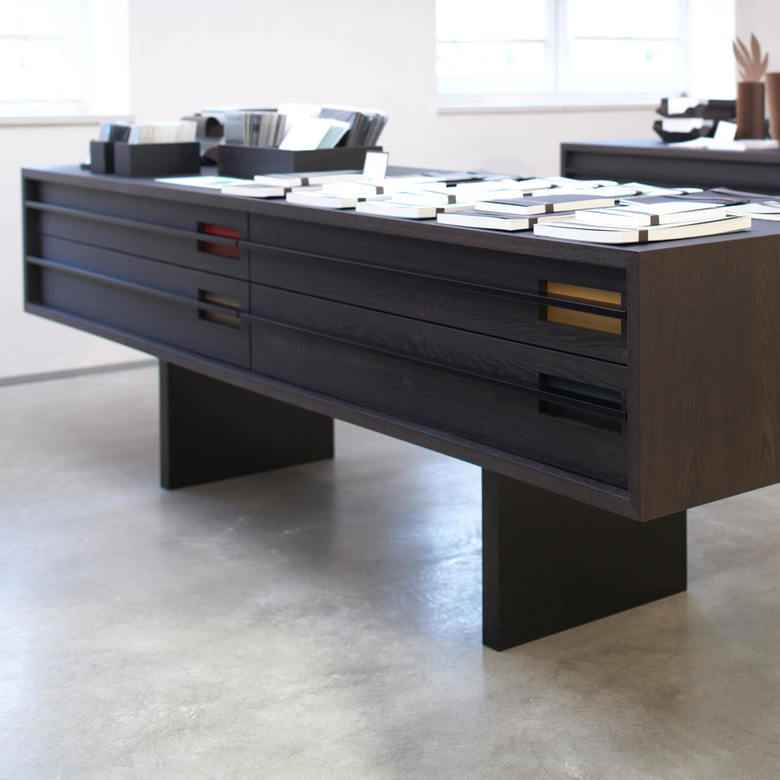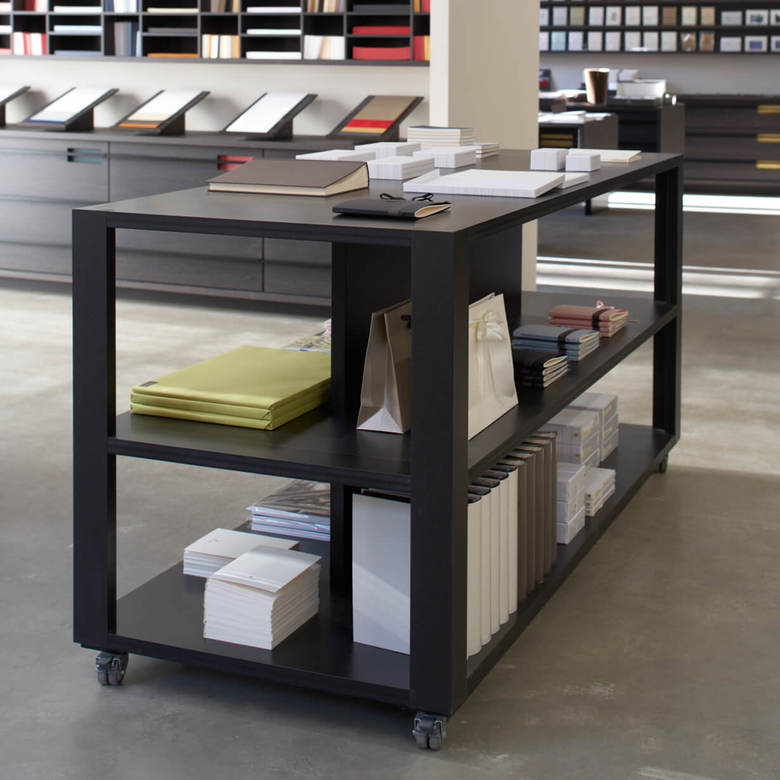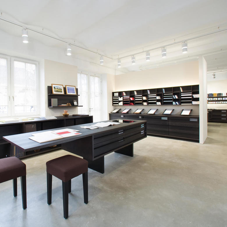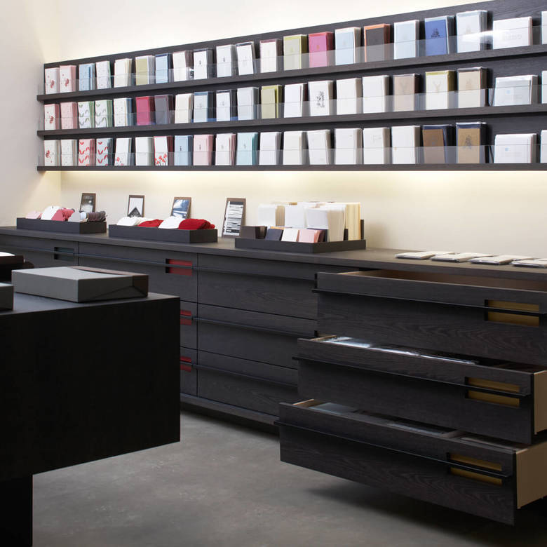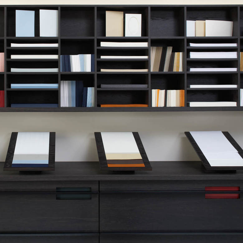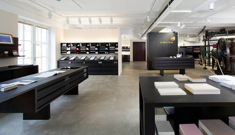 Grund genug für die Büttenpapierfabrik Gmund ein eigenes Shopkonzept zur Präsentation der hochwertigen Produkte entwickeln zu lassen. Diverse modulare Displays wurden entworfen, die je nach Anspruch und Produktsortiment der Shops miteinander kombiniert werden. Edles Mooreichenholz und eine schlichte Formgebung schaffen den eleganten Rahmen für die exquisiten Papiere in verschiedenen Farben und Formaten.
