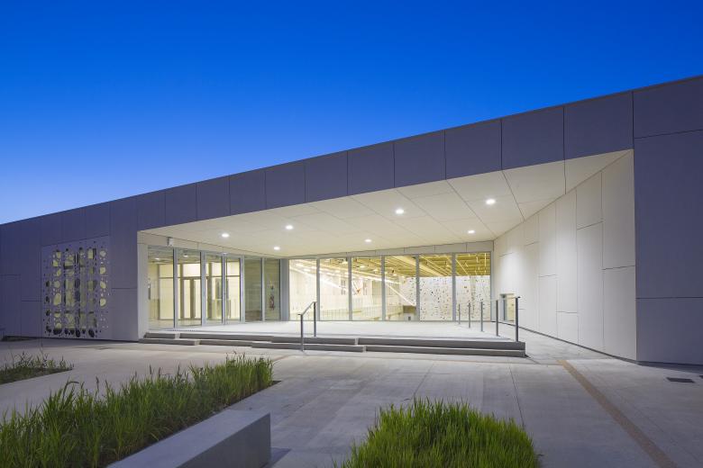 Un des enjeux majeurs de l’opération réside donc dans sa capacité à générer de l’urbanité. Ainsi le parvis joue un rôle primordial, pensé comme une place urbaine, il se veut homogène dans sa représentation, unissant les éléments piétonniers tout comme les zones de stationnement. Entièrement vitrée, l’entrée de la halle de sports offre une transversalité visuelle depuis le parvis directement vers la zone de jeux. La nuit, elle constitue un signal pour les visiteurs.