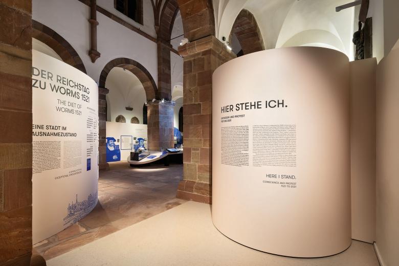 Die kulturhistorische Ausstellung „Hier stehe ich. Gewissen und Protest – 1521 bis 2021“ beleuchtet anlässlich des 500-jährigen Jubiläums in der zweiteiligen Landesausstellung den Widerruf Martin Luthers auf dem Wormser Reichstag. Im Mittelpunkt der Ausstellung steht der Auftritt Martin Luthers in Worms 1521 sowie dessen Bedeutung und Mythos. Der Mythos entstand zeitnah mit dem historischen Ereignis und entwickelte bis heute eine ungeheure Dynamik. Im zweiten Teil fokussiert die Ausstellung das Thema „Gewissensfreiheit“ selbst, deren Entwicklungsgeschichte anhand zahlreicher Beispiele bis in unsere Gegenwart aufgezeigt und kritisch hinterfragt wird.