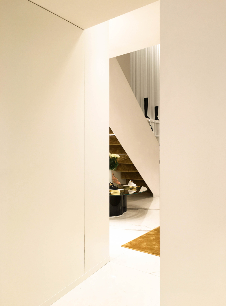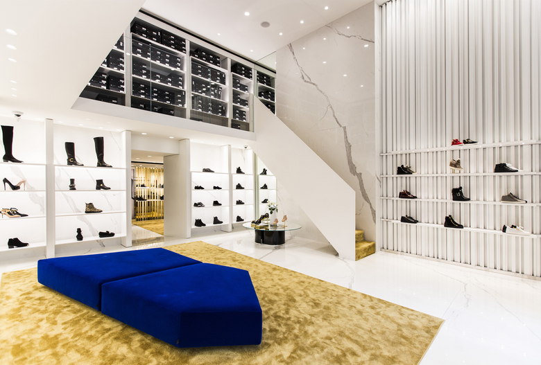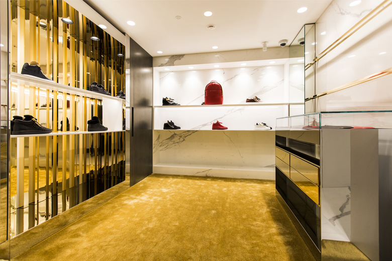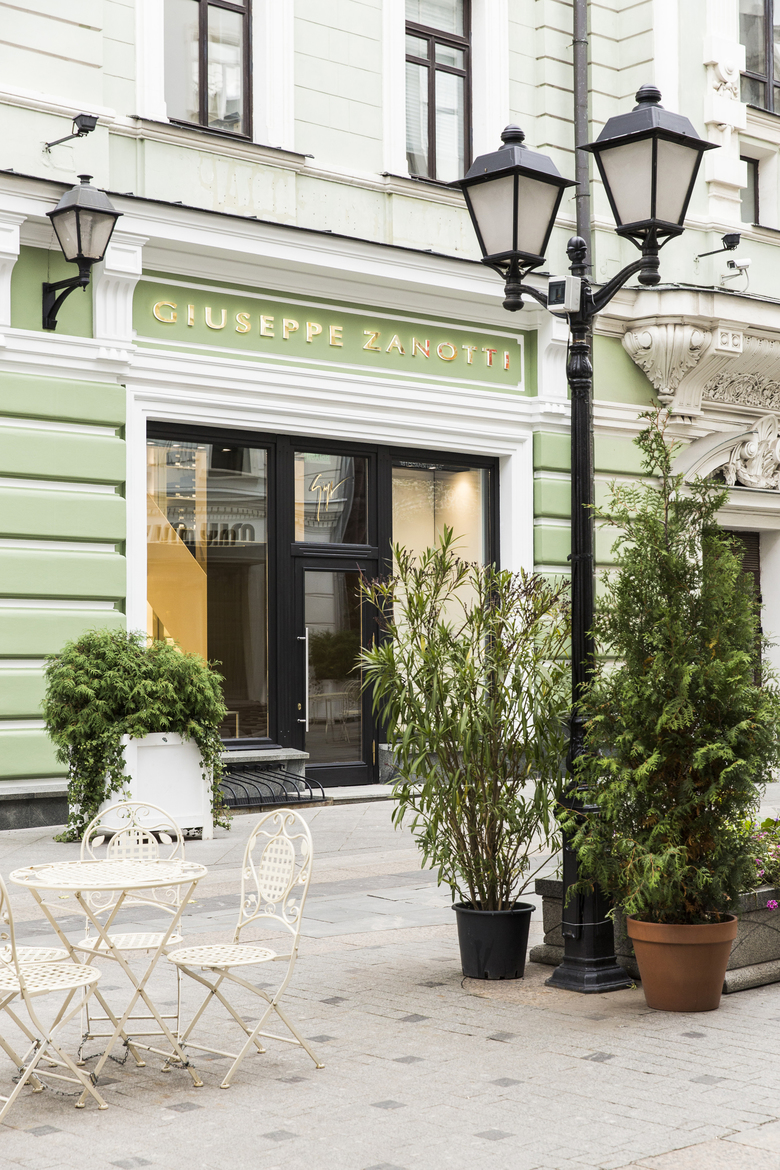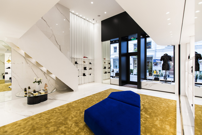 Il negozio di Mosca, aperto sull’onda del successo delle tre boutique in franchise già esistenti, è il primo direttamente gestito dalla maison nella capitale russa. Lo spazio vendita al piano terra è diviso in due locali fronte strada. Una caratteristica composizione di scaffali a parete su più livelli trasforma l’ingresso in un ampio spazio espositivo; sul pavimento in marmo, tappeti di un intenso color senape e divani blu Klein donano colore allo spazio, in sintonia con il brand Giuseppe Zanotti.