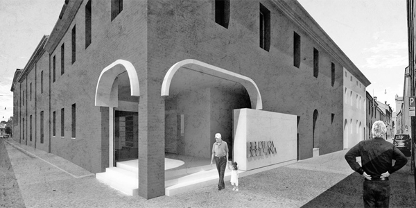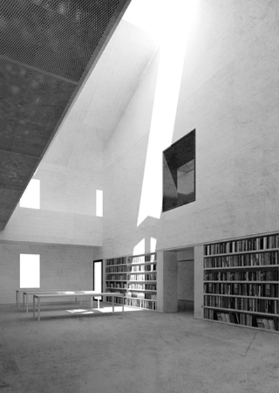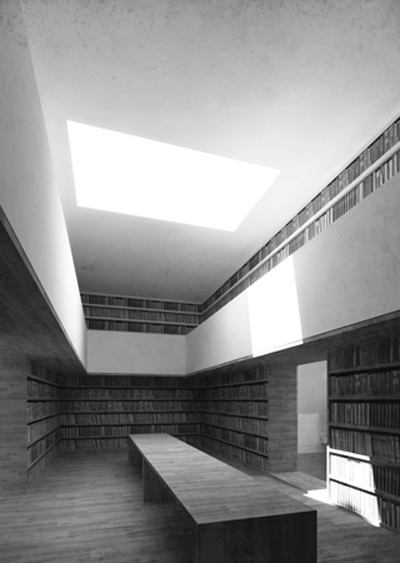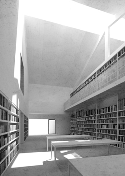 La nuova biblioteca diocesana di Ravenna si svilupperà su tre piani fuori terra (terra, primo e secondo piano) e sarà caratterizzata da una grande sala a tripla altezza che occuperà l'intero volume della ex sala cinematografica. Il piano terra sarà destinato alla fruizione del pubblico mentre i restanti due piani saranno riservati al personale di servizio ed adibiti ad uffici, laboratori e depositi, ad esclusione della sala riservata alla sezione "fondi antichi" dell'archivio che avrà un accesso accompagnato e controllato. Il progetto, mira ad una ottimizzazione degli spazi esistenti ai fini di una elevata capacità di contenimento del numero di volumi da conservare e di una loro integrazione con le nuove destinazioni d'uso previste, attraverso una soluzione semplice che sostanzialmente va a riutilizzare il volume dell'ex cinema come un unico grande contenitore per libri a tripla altezza. Una grande scaffalatura integrata con un sistema di passerelle metalliche, renderà il libro il protagonista all'interno del grande volume a tripla altezza del nuovo edificio. Il grande spazio, che oltre all'archivio librario, conterrà anche una sala multifunzionale aperta al pubblico, si manifesterà all'esterno soltanto attraverso la scansione regolare delle aperture esistenti in facciata. Un grande lucernario in copertura, posto linearmente in corrispondenza del colmo, illuminerà gli spazi sottostanti. Tre capriate in legno ritmeranno il spazio interno. La grande sala archivio e consultazione sarà inoltre in diretto contatto visivo e fruitivo con l'emeroteca, ubicata al piano terra in prossimità dell'ingresso. Qui è prevista l'unica soluzione architettonica manifesta in facciata: un piccolo inserto contemporaneo che accoglierà l'insegna della biblioteca diocesana e conterrà al suo interno i cancelli scorrevoli per la chiusura notturna del piccolo portico di accesso esistente. Ai due piani superiori, vi si accederà tramite due scale diverse scale. La scala principale, adiacente alla hall di ingresso, servirà anche la sezione fondi antichi posta al piano primo, con accesso controllato. La seconda scala invece, posta all'estremità opposta dell’ingresso, sarà un collegamento verticale di servizio cielo-terra. Tutte le funzioni impiantistiche saranno collocate in un terrazzo ad asola nella copertura, raggiungibile, oltre che dalla scala sopra descritta, anche dall'ascensore ad esso adiacente. Tutta la copertura verrà realizzata ex novo, e seguirà le geometrie dello stato attuale tranne che per il terrazzo impiantistico e per un piccolo volume scatolare posto al di sopra della scala limitrofa all'ingresso che permetterà l'illuminazione della scala stessa attraverso un lucernario. Lo spazio così conformato rientra inoltre all'interno di una logica progettuale che diviene linguaggio architettonico, quella dello spazio stretto compresso all'interno di due alte pareti verticali laterali dove la luce zenitale filtra in maniera inaspettata.