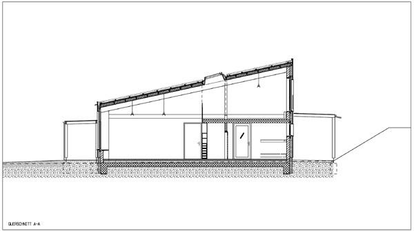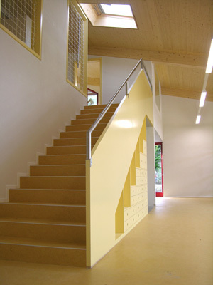 Das Raumangebot ist auf zwei Geschosse verteilt. Im Erdgeschoss liegt der Hauptraum des Kindergartens welcher über einen Windfang und die Garderobenanlage erreicht wird. Der Garderobe zugeordnet ist ein Sanitärbereich mit WC-Anlagen, Putz- und Installationsraum. Zum Hauptraum gehören eine Spielnische und ein Gruppenraum, welcher auch direkt vom Windfang aus zugänglich ist und auch von einem zweiten Kindergarten genutzt werden kann.