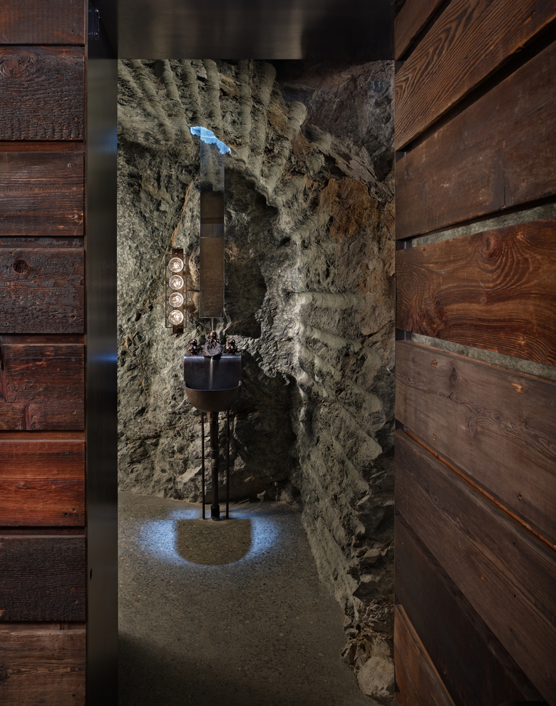 Throughout the house, the rock extrudes into the space, contrasting with the luxurious textures of the furnishings. Interior and exterior fireplace hearths are carved out of existing stone; leveled on top, they are otherwise left raw. The master bathroom’s sink is composed of water cascading through three polished pools in the existing stone. Off the main space, a powder room is fully carved out of the rock. A skytube runs through to the top of the rock and is topped by glass. A mirror set within the tube serves as a focal point, reflecting natural light into the space and connecting to a forged bronze sink.