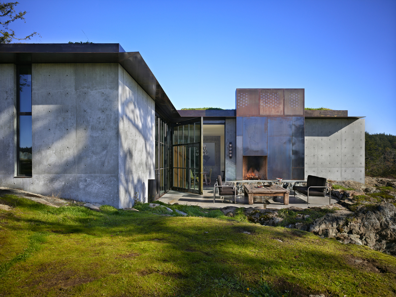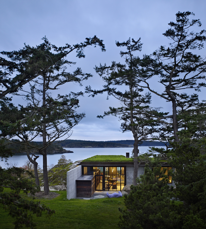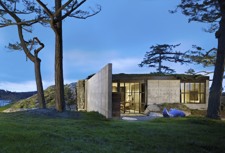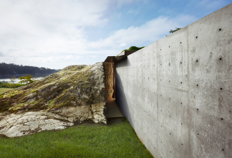 The owner’s affection for a stone outcropping on her property and the views from its peak inspired the design of this house. Conceived as a bunker nestled into the rock, the Pierre, the French word for stone, celebrates the materiality of the site. From certain angles, the house – with its rough materials, encompassing stone, green roof and surrounding foliage – almost disappears into nature.