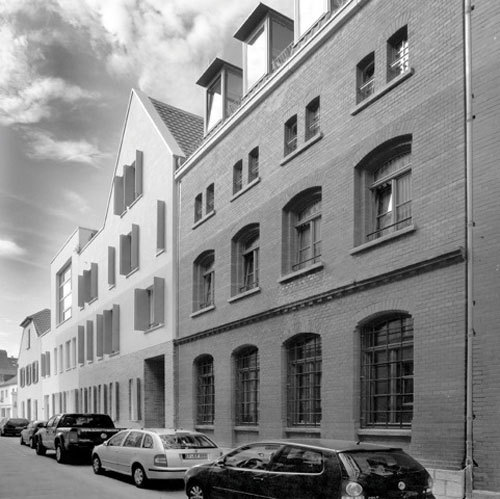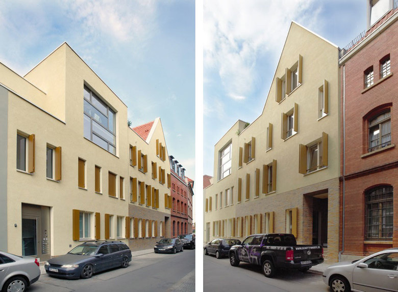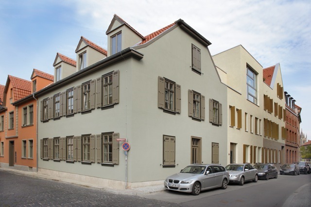 Zur Ergänzung der Quartierskante wurden eigenständige Stadtbausteine entwickelt und in die jeweilige Baulücke implantiert. Dabei übernehmen sie die Rolle konsequenter Vermittler zwischen Alt und Neu und schaffen proportionalen Bezug zwischen den baulichen Volumen verschiedenster Epochen durch das Auffangen und Übersetzen auch stark unterschiedlicher First- und Traufhöhen. Gleichwohl behaupten sie sich als Unikate innerhalb der Blockfassung durch das Motiv der Zwerchhäuser mit geraden und geneigten Giebelkanten, das Wiedererkennbarkeit garantiert. Die neuen Bausteine tragen Tradition von Neuem und Überliefertem in sich ohne zu historisieren oder zu wichten. Sie bieten Zusammengehörigkeit in der Formensprache im Herzen Erfurts an bei gleichzeitiger Individualität und Einzeladressbildung. Das Wohnungsangebot auf ca. 5000qm reicht bei 51 Wohneinheiten von atmosphärischem Altbau, über Maisonettewohnungen mit Gartenanbindung, klassischer Geschosswohnung mit grosszügiger Loggia/Balkon/Patio bis zum Penthouse mit Dachgarten oder gar dem „Haus auf dem Haus“ (Alte Schmiede). Die Flexibilität wird hierbei nicht nur im vielfältigen Angebot und der Reduktion der tragenden Wände zur Förderung frei teilbarer Grundrissfiguren gesehen, sondern auch in Raumzuschnitten, die quasi gleich gross sind und keine Zwänge zur Nutzung vorgeben. Dabei ist die Grössenerweiterung durch Zusammenschluss unkompliziert erreichbar.