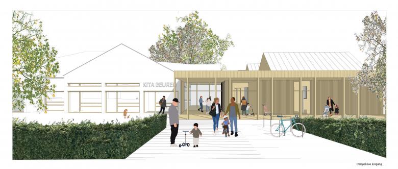 Auszug Jurybeurteilung: „...Die Verfasser erweitern die Kindertagesstätte als eingeschossigen Baukörper, der durch ein großzügiges Vordach einen überzeugenden und einladenden Zugang artikuliert. Der Grundriss des Neubaus ist geschickt strukturiert. Durch Aufweitungen in den wesentlichen Bereichen ergeben sich schlüssige Raumfolgen und eine gute Nutzbarkeit im Inneren. Der großzügige Innenhof erlaubt eine hinreichende Belichtung und Bespielung. Trotz Ausrichtung der Gruppenräume zur Wohnbebauung ergeben sich durch die Rücksprünge zwar kleine, aber attraktive und konzentrierte und den Gruppen direkt zugeordnete Freibereiche. Allerdings wird bedauert, dass sich somit alle Gruppenräume von den großen Außenflächen abwenden. Eine Zuordnung des Bistros zum Vorplatz wäre von Vorteil, um diesen konzeptionell stärker einzubeziehen und seine Qualitäten für die Kindertagesstätte nutzen zu können. Der Zugangsbereich wirkt elegant und einladend. Die Material- und Konstruktionswahl ist angemessen....“