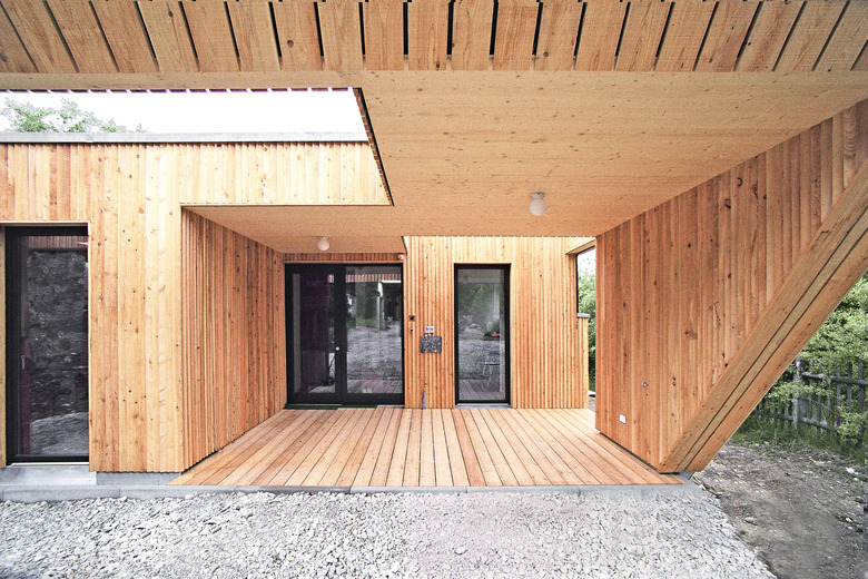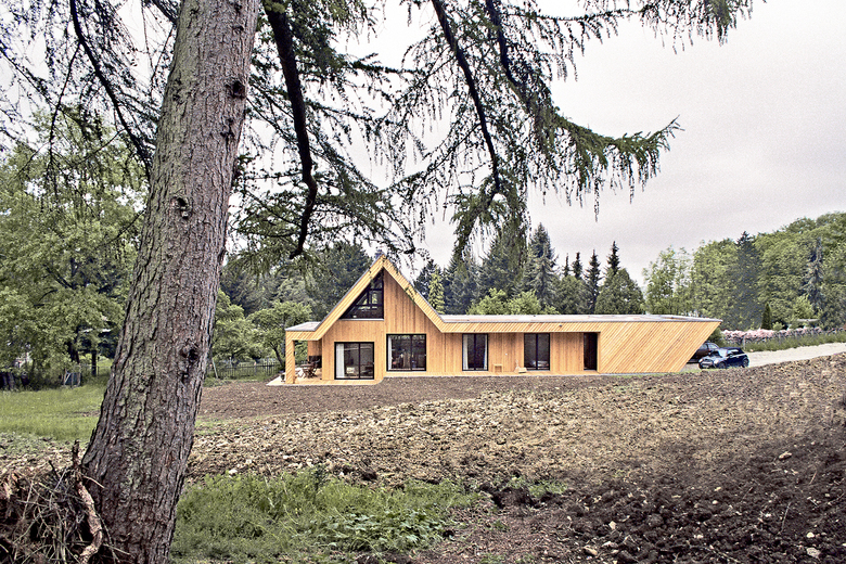 für die konstruktive Tradition des Erzgebirges sowie für deren Sehnsucht nach Gemütlichkeit. Dichtere räumliche Fassungen, die Materialität, auch die archetypische Dachform verhelfen dazu. Großzügige Dachüberstände erlauben Assoziationen zu Schutzhütten in abgelegener Natur und sind gleichermaßen vertraut durch vielfältige Verandanutzung zwischen innen und außen. Das Feuer im Wohnbereich - Holzkochofen und Kamin mit Ofenbank, auch vertikal im Umluftsystem zum Dachraum - ist elementar wie ehedem in der Geschichte des Wohnens und eben auch unbedingt mit schottischen Häusern verbunden. Hier wird es zentraler Bezugspunkt vom Entree bis zum gemeinschaftlichen Aufenthalt.