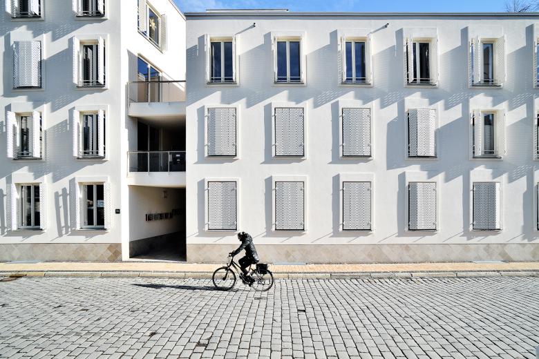 Die stehenden großzügigen Fensterformate perforieren gleichmäßig die verputzte Mauerwerksfassade, die klassisch auf einem Sockel ruht. Konzipiert ist hier der Wechsel von hellem gröberen Kratzputz der Wandflächen zu hellem Kalksteinsockel. Die Fenster- und Fensterfaschen werden als Holzelemente (ggf. Aluminium) vorgeschlagen. Sie werden als Elemente feiner Gliederung in ungleicher Breite eingesetzt, so dass feine Steigerungen zu den Quartiersecken hervorgehoben werden. Die rautenförmige Perforation der Fensterläden unterstützt mit leichter Ornamentik das Quartiersthema und reiht sich in den Kanon typischer Gestaltungselemente der schönen nachbarschaftlichen Gebäude. Pragmatisch sind sie zudem Sonnen- und Sichtschutz und dem Sicherheitsgefühl zuträglich.