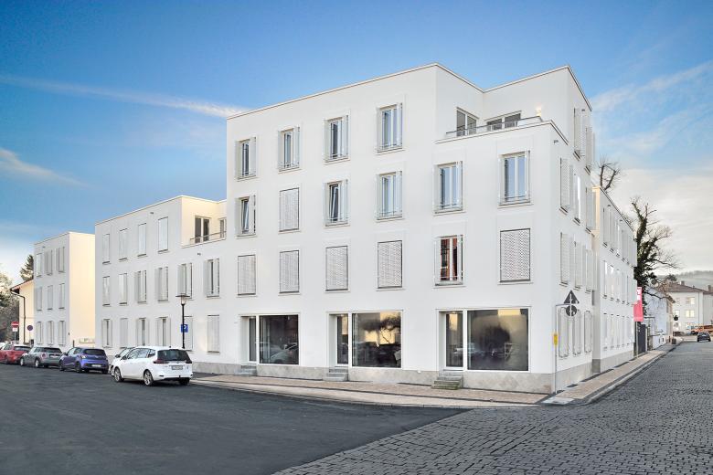 Die besondere Nutzung dieses Bereiches bildet sich in der Ansicht des Eckhauses ab, hier treten großformatigere bodentiefe Fenster in Erscheinung. Der neue KAROlinenhof stellt sich in klaren Konturen dar, deren Geradlinigkeit und symmetrische Figuration eine zeitgenössische Interpretation spätklassizistischer Elemente der umgebenden Architektur ist.